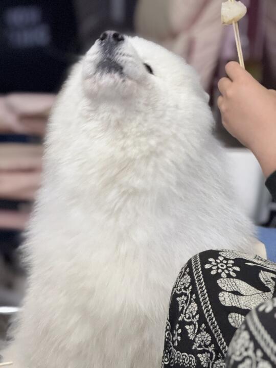 🐶:就这么盯着,好吃的会掉下来的吧!