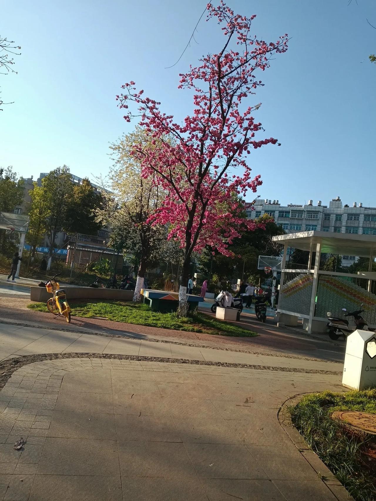 季春草绿花又红,有花无叶有刺桐。樱花树树红似火,南风爽爽翠碧隆!
