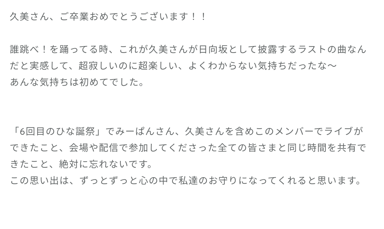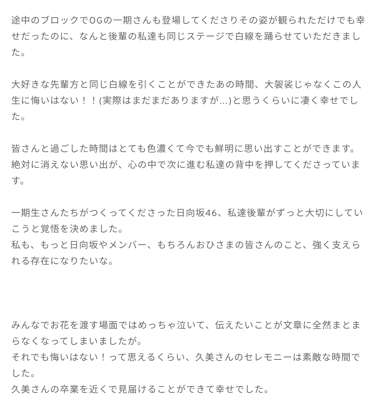 ひなの「途中のブロックでOGの一期さんも登場してくださりその姿が観られただけでも幸せだったのに、なんと後輩の私達も同じステージで白線を踊らせていただきました。大好きな先輩方と同じ白線を引くことができたあの時間、大袈裟じゃなくこの人生に悔いはない!!(実際はまだまだありますが…)と思うくらいに凄く幸せでした。」