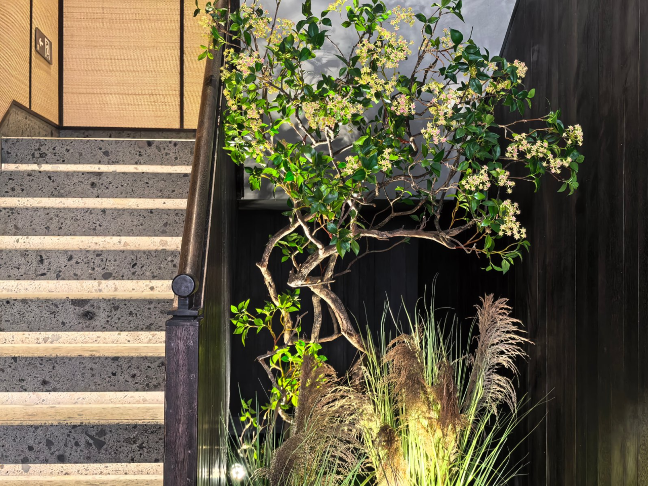 拾级而上,忽见满树绿意。桂树枝条舒展,花开正好,树下芦苇荡漾,仿佛室内生出了一处小小山林。动静之间,让人忘却台阶的陡直,而只觉生命的流动。