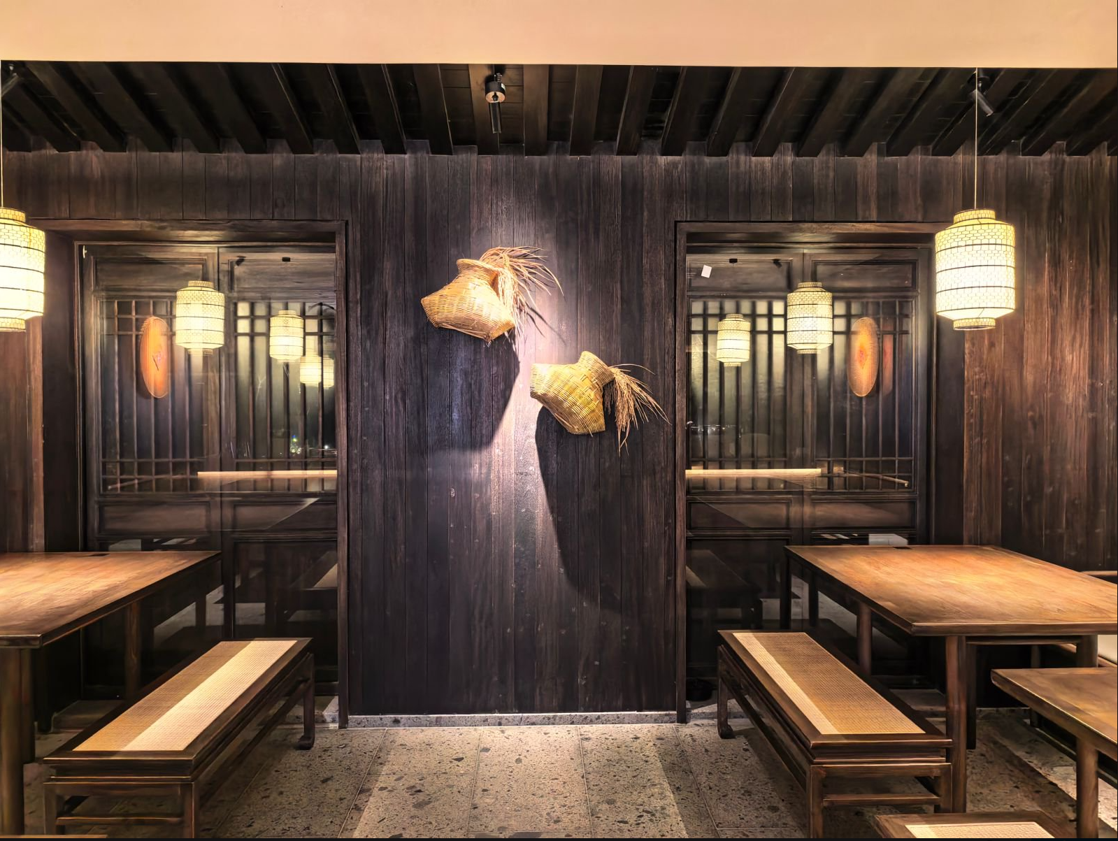 深色木壁与竹编饰物交织,简洁而克制。两侧木桌排布整齐,墙上的灯影若浮雕般静默,带来一种安稳的秩序感。