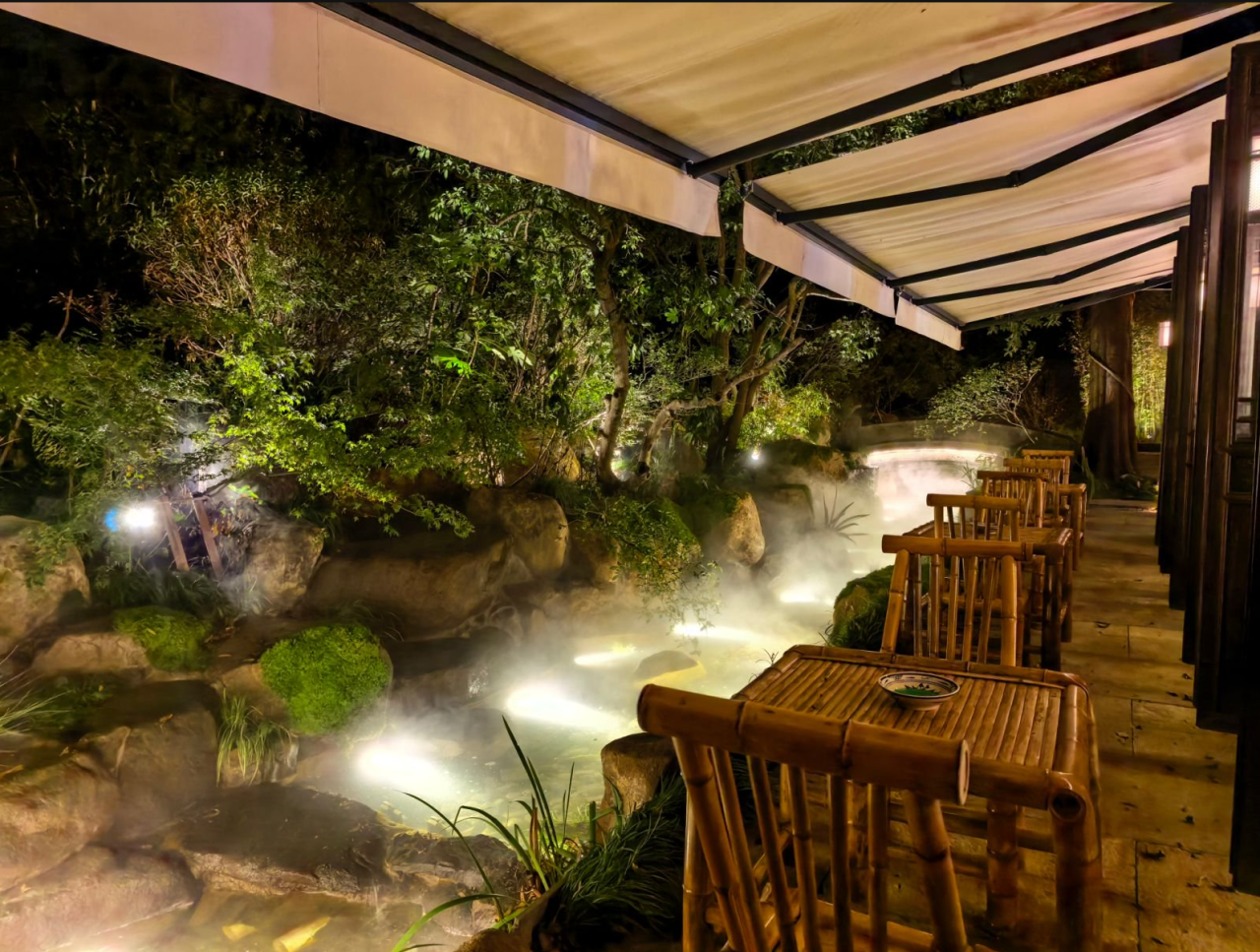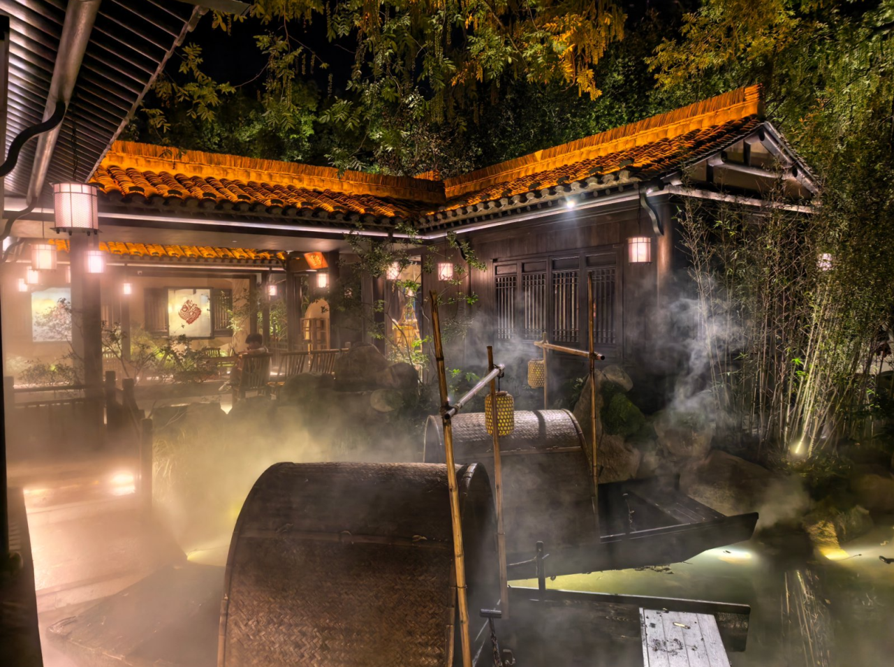 夜色中,黛瓦屋檐下水雾氤氲,似有山泉自院中生发。桌椅依次铺排,围坐之间,人与景融为一体,平添几分江南烟火气。