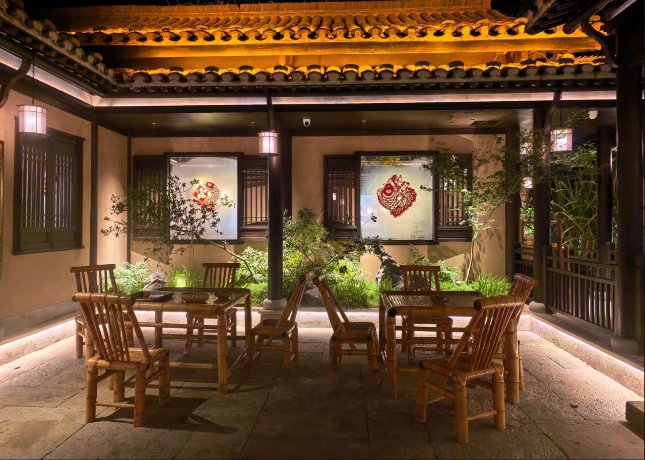 月色与暖灯设计将竹质桌椅映得格外温润,窗上的正红色非遗剪纸与院中绿植色彩对比鲜明,让原本素雅的空间多了一份灵动与喜气。人们在此品茗,仿佛落座于一处千年以前的农家小院,古色古香的同时又充满生活气息。