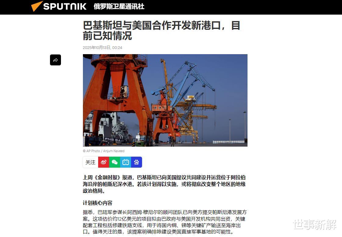 10月13日,据俄罗斯卫星通讯社援引《金融时报》报道,巴方已经邀请美国到巴建设深水港。具体位置距离中方运营的瓜达尔港70海里。这是一个位于阿拉伯海沿岸的帕斯尼镇的渔港,距离伊朗边境也只有100海里,战略位置重要。
