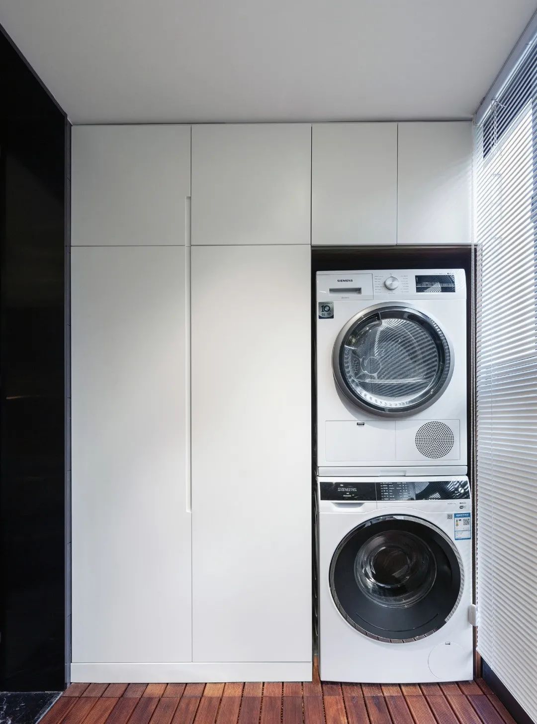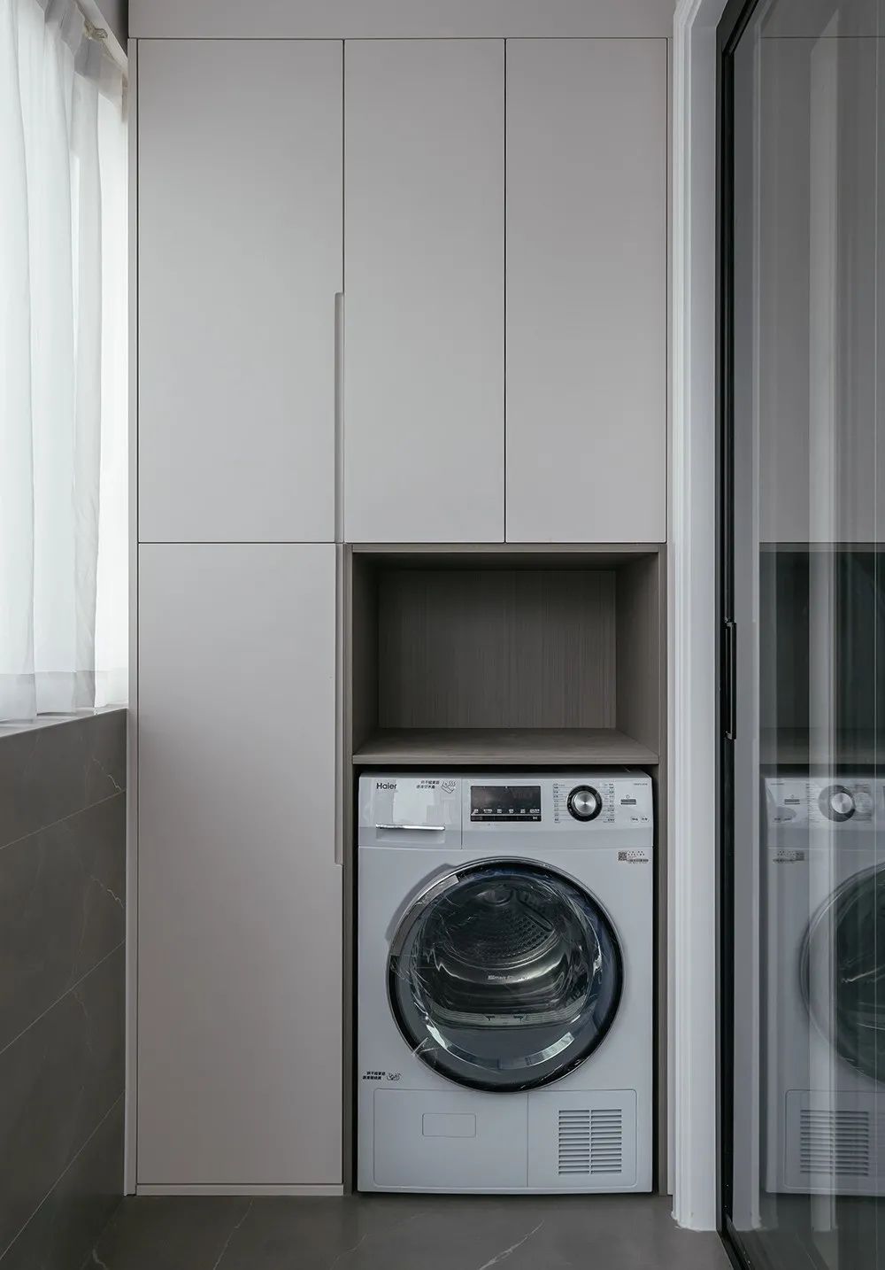 方案 03:洗衣烘干一体机 + 收纳柜 → 功能最精简,适合只需要洗衣和储物的家庭,最大化节省空间。
