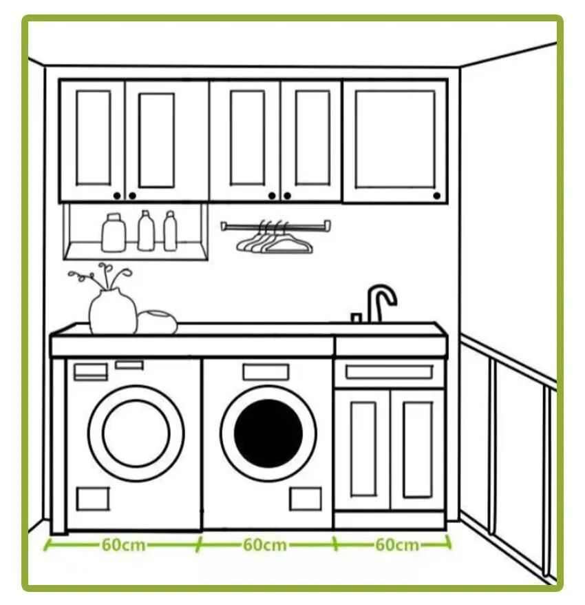 方案 02:洗衣机烘干机并排摆放 + 洗手盆 + 储物柜 → 比方案 01 多了封闭储物柜,收纳能力更强,适合杂物多的家庭;