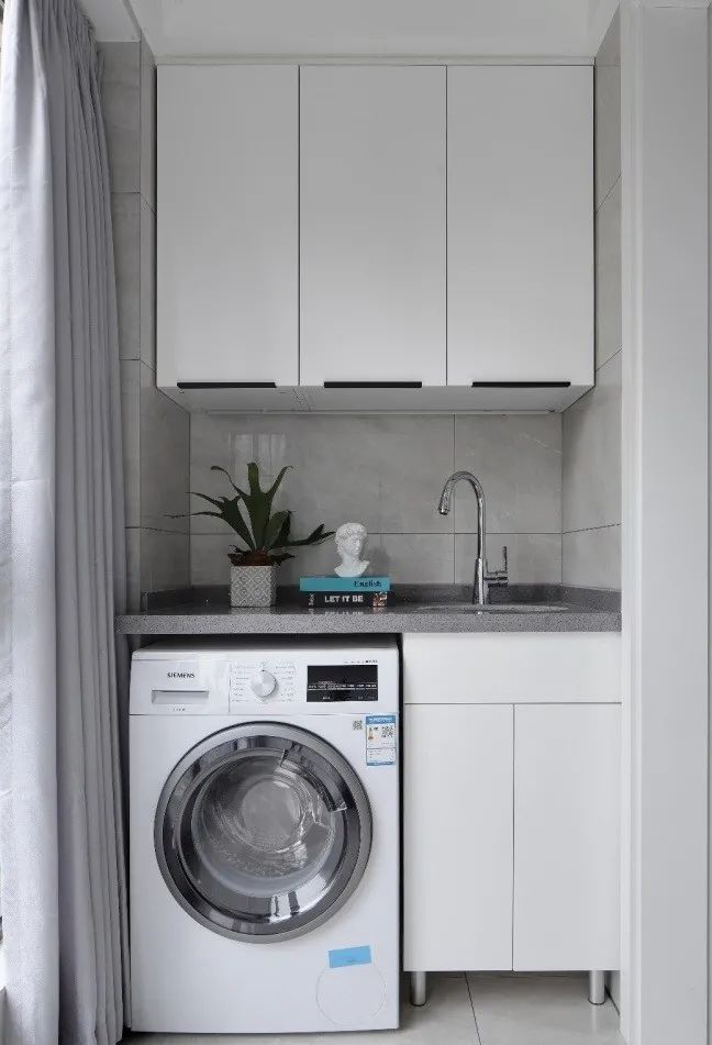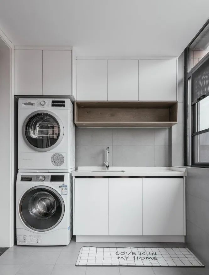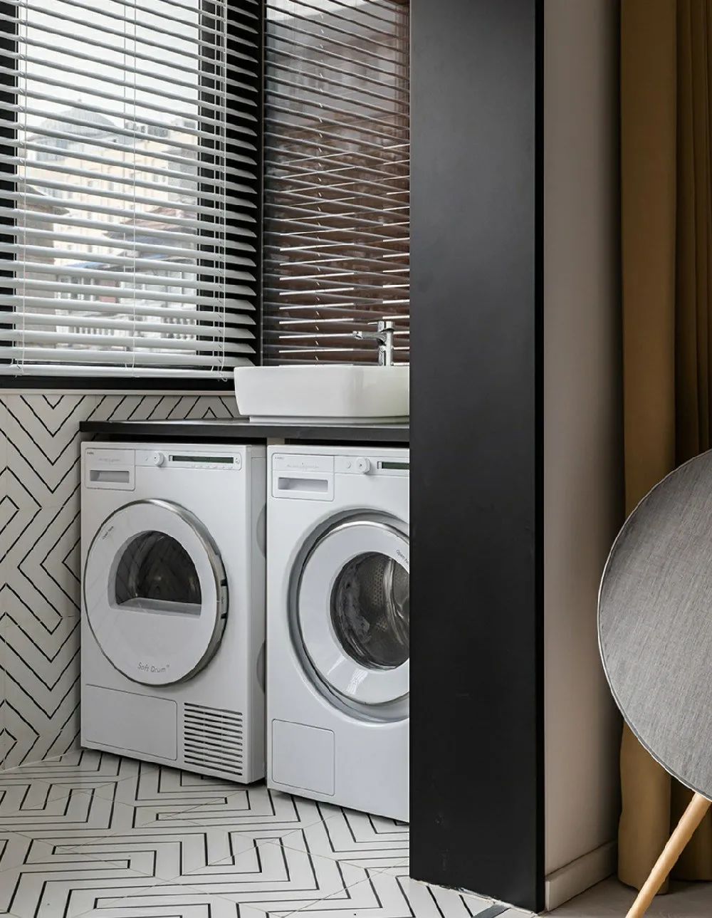 方案 01:洗衣机烘干机并排摆放 + 洗手池 + 隔板 → 并排摆放 + 洗手池满足基础需求,隔板放装饰或轻便物品,增加空间层次;