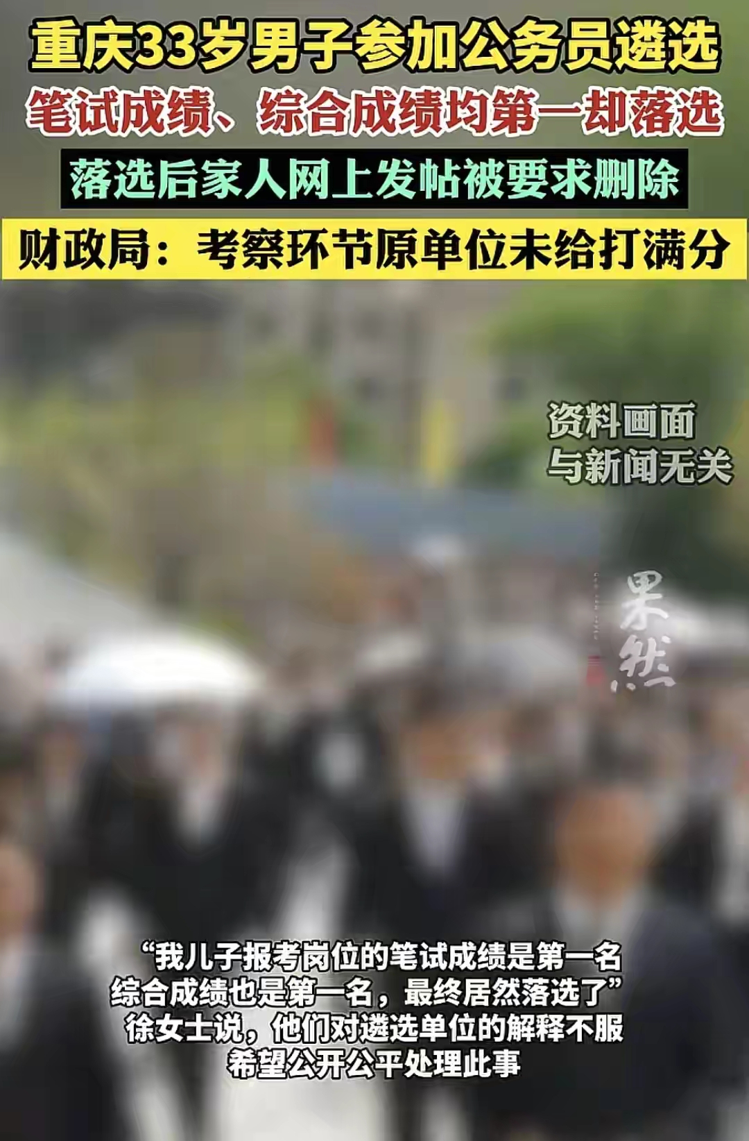 “我儿子报考岗位的笔试成绩是第一名,综合成绩也是第一名,最终居然落选了。”近日,重庆33岁硕士齐挺(化名)报考重庆市财政局“综合管理2”岗位公务员遴选一事引发广泛关注。据了解,齐挺笔试斩获81.5分,面试取得77.4分,按照笔试、面试各占50%的权重计算,综合成绩79.45分,两项成绩均在该岗位考生中位列榜首。凭借这份亮眼的成绩单,他顺利通过严格的资格审查与全面体检,成功进入决定最终录用结果的考察环节,可谁也没想到,这临门一脚竟成了泡影。