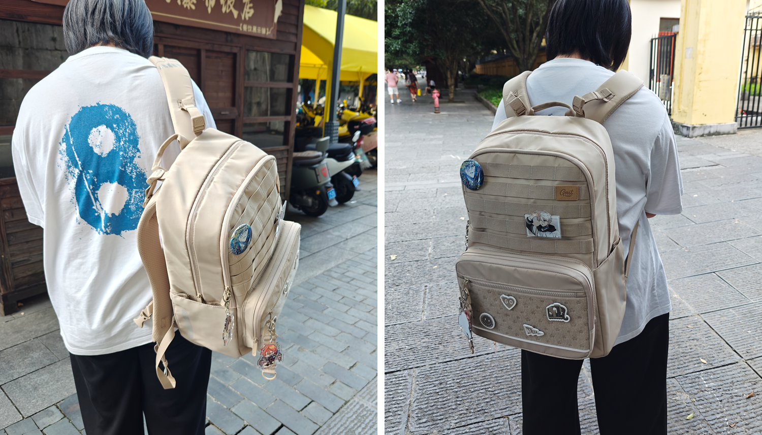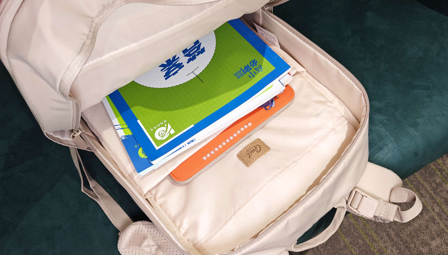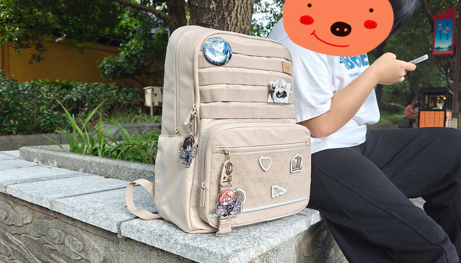 在收纳设计上,书包采用了多隔层科学分区设计,包括主拉链袋、前隔层拉链袋、前脸立体贴袋、侧袋和前脸拉链袋等,仿佛为每一件物品都规划好了专属的“居住空间”。