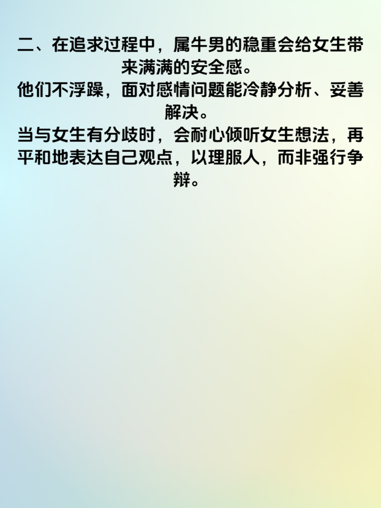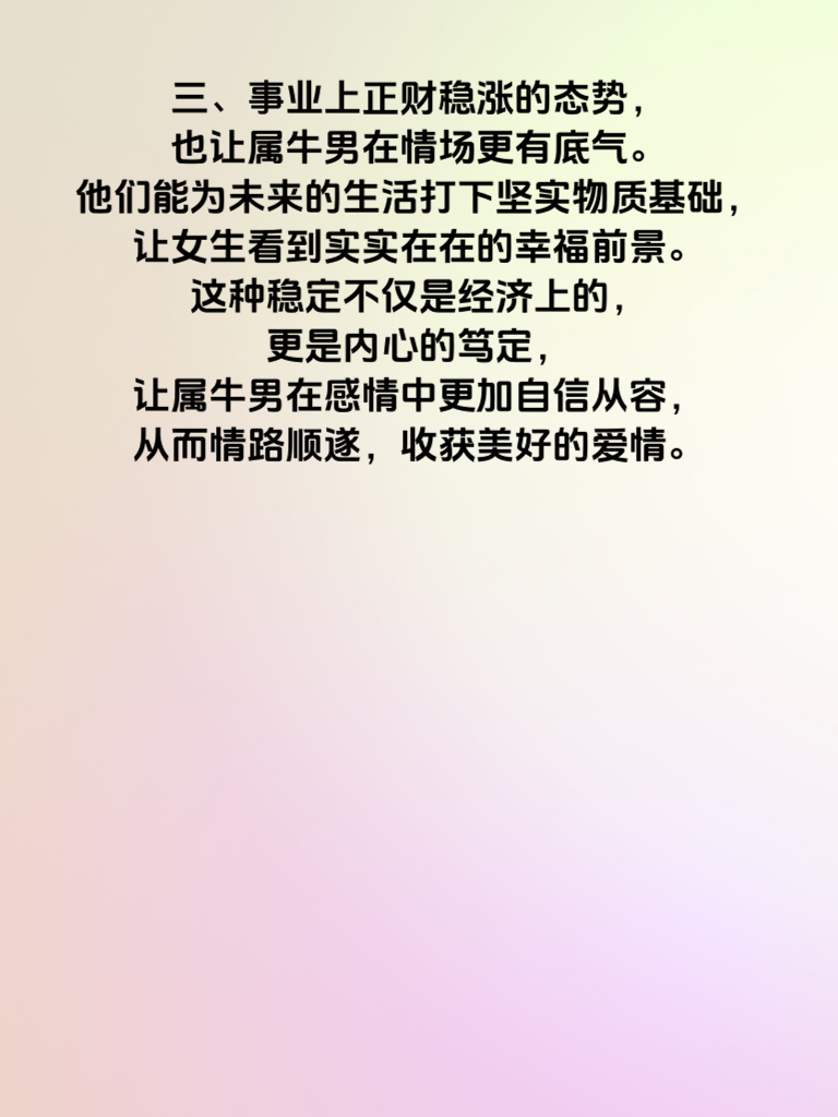 一、2025 年对于属牛男来说,情路似乎铺就了坦途。属牛男本就踏实稳重,在这一年更是将自身优点发挥到极致。他们对待感情真诚且执着,会用实际行动去关心呵护心仪的女生。比如,记住女生的喜好,在特殊日子送上贴心礼物,让女生真切感受到被重视。 二、在追求过程中,属牛男的稳重会给女生带来满满的安全感。他们不浮躁,面对感情问题能冷静分析、妥善解决。当与女生有分歧时,会耐心倾听女生想法,再平和地表达自己观点,以理服人,而非强行争辩。 三、事业上正财稳涨的态势,也让属牛男在情场更有底气。他们能为未来的生活打下坚实物质基础,让女生看到实实在在的幸福前景。这种稳定不仅是经济上的,更是内心的笃定,让属牛男在感情中更加自信从容,从而情路顺遂,收获美好的爱情。