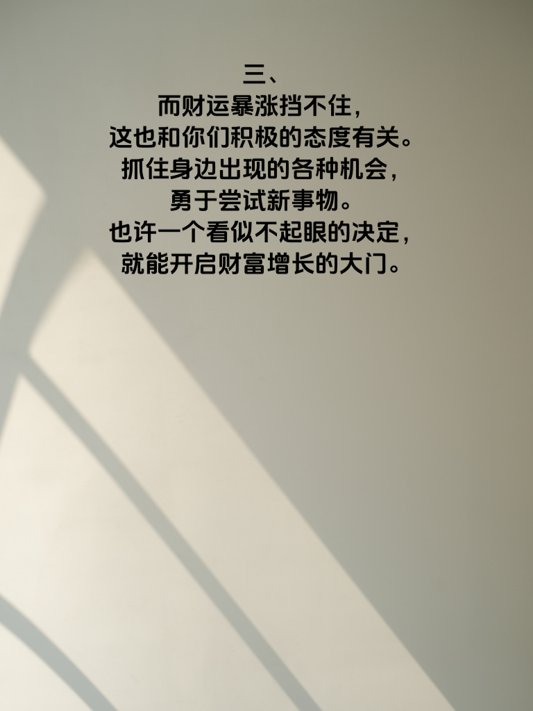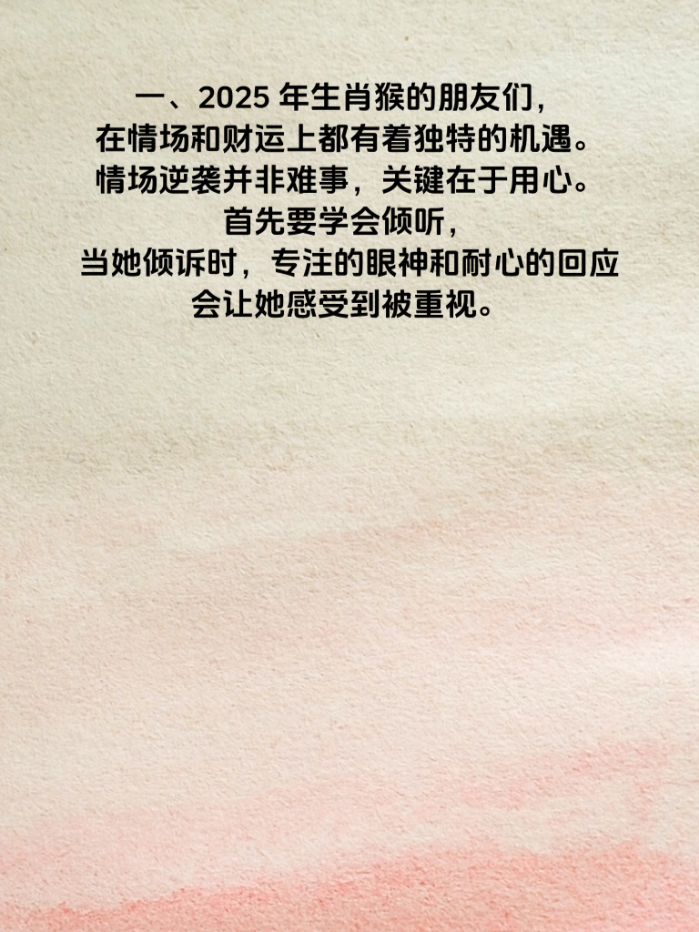 一、2025 年生肖猴的朋友们,在情场和财运上都有着独特的机遇。情场逆袭并非难事,关键在于用心。首先要学会倾听,当她倾诉时,专注的眼神和耐心的回应会让她感受到被重视。 二、展现真实的自己也很重要。无需刻意伪装,真诚的个性更容易打动人心。在相处中,偶尔制造一些小惊喜,一束鲜花、一份心仪的小礼物,都能增添浪漫氛围。 三、而财运暴涨挡不住,这也和你们积极的态度有关。抓住身边出现的各种机会,勇于尝试新事物。也许一个看似不起眼的决定,就能开启财富增长的大门。 四、生肖猴的你们聪明灵活,在情场和商场都能凭借自身优势。保持乐观向上的心态,面对感情不气馁,面对财富不贪婪。如此,情场收获甜蜜爱情,财运也会滚滚而来。