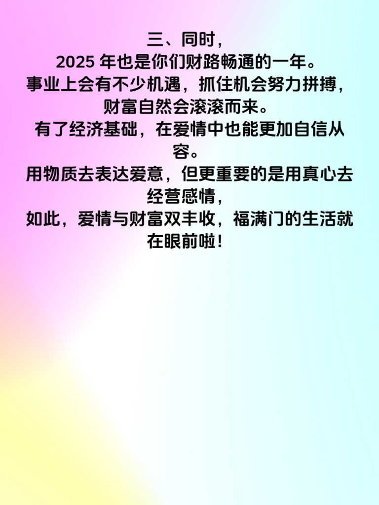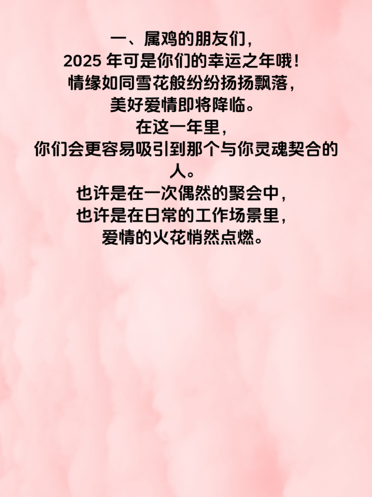 一、属鸡的朋友们,2025年可是你们的幸运之年哦!情缘如同雪花般纷纷扬扬飘落,美好爱情即将降临。在这一年里,你们会更容易吸引到那个与你灵魂契合的人。也许是在一次偶然的聚会中,也许是在日常的工作场景里,爱情的火花悄然点燃。 二、追求爱情时,要展现出自己真诚且独特的一面。属鸡的你们聪明伶俐,那就用智慧去关心对方,用细腻的心思去发现对方的喜好。比如,为对方准备一份贴心的小礼物,或是记住对方不经意间提到的小愿望,让对方感受到你的用心。 三、同时,2025年也是你们财路畅通的一年。事业上会有不少机遇,抓住机会努力拼搏,财富自然会滚滚而来。有了经济基础,在爱情中也能更加自信从容。用物质去表达爱意,但更重要的是用真心去经营感情,如此,爱情与财富双丰收,福满门的生活就在眼前啦!