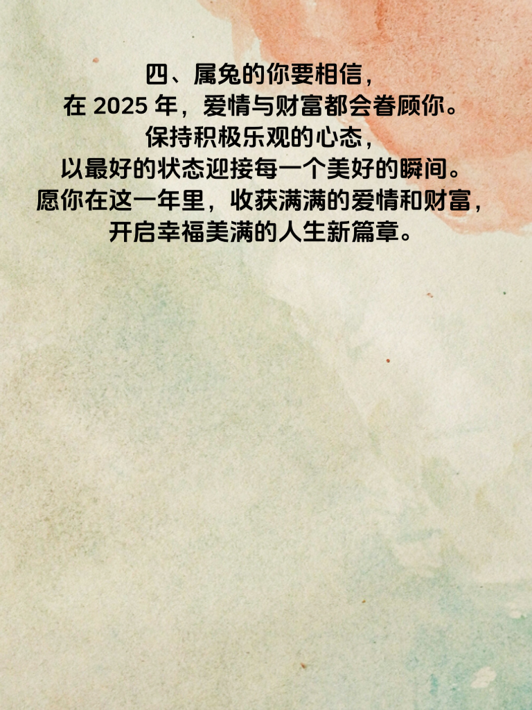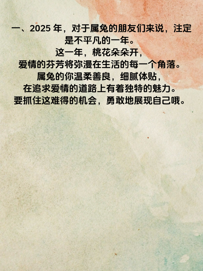 一、2025 年,对于属兔的朋友们来说,注定是不平凡的一年。这一年,桃花朵朵开,爱情的芬芳将弥漫在生活的每一个角落。属兔的你温柔善良,细腻体贴,在追求爱情的道路上有着独特的魅力。要抓住这难得的机会,勇敢地展现自己哦。 二、当爱情悄然来临时,不要羞涩。主动出击,用真诚的心去对待心仪的她。了解她的喜好,在特别的日子送上精心准备的小惊喜。比如,知道她喜欢看书,就送她一本她一直想看却没买到的书。 三、同时,2025 年也是财运滚滚来的一年。在感情中,经济基础也很重要。努力提升自己的事业,增加收入,让自己变得更加优秀和有吸引力。这样不仅能给爱情提供更好的物质保障,也能让自己更有自信。 四、属兔的你要相信,在 2025 年,爱情与财富都会眷顾你。保持积极乐观的心态,以最好的状态迎接每一个美好的瞬间。愿你在这一年里,收获满满的爱情和财富,开启幸福美满的人生新篇章。