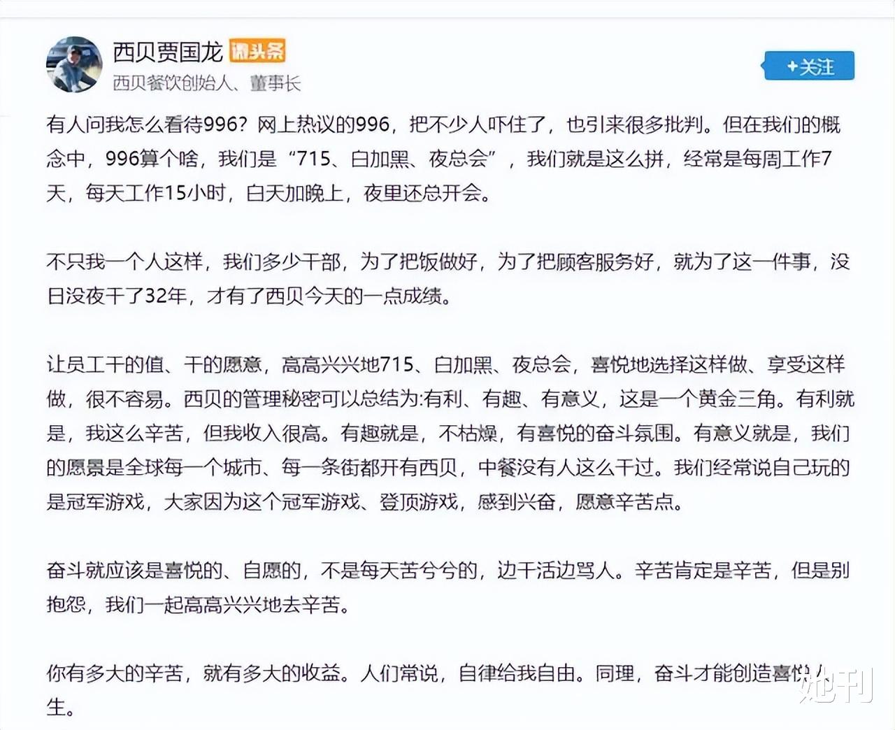 2020年,他在社交媒体上谈论加班,表示“996算个啥”,西贝的员工是“715工作制”,每周工作7天,每天工作15小时,白天加晚上,夜里还总开会。