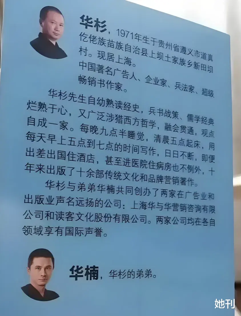 简介上写着,哥哥华杉是广告人、是企业家、是兵法家、还是超级畅销书作家,四重身份加持,堪称广告界大冰。