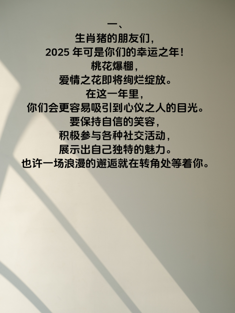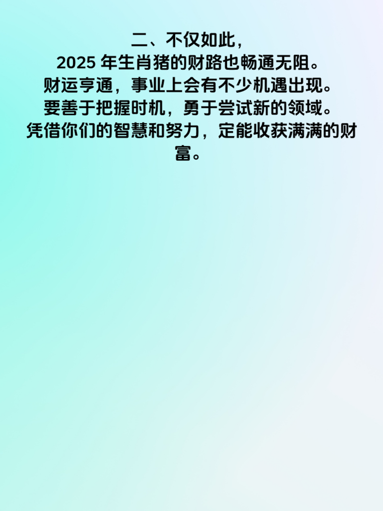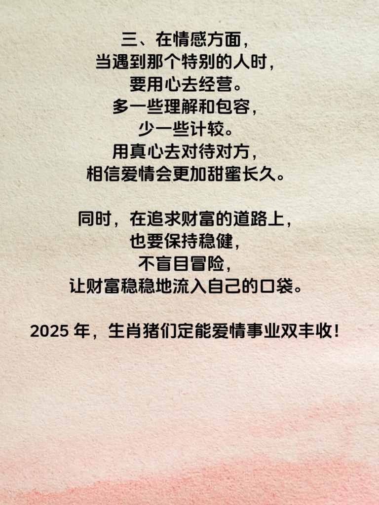 一、生肖猪的朋友们,2025年可是你们的幸运之年!桃花爆棚,爱情之花即将绚烂绽放。在这一年里,你们会更容易吸引到心仪之人的目光。要保持自信的笑容,积极参与各种社交活动,展示出自己独特的魅力。也许一场浪漫的邂逅就在转角处等着你。 二、不仅如此,2025年生肖猪的财路也畅通无阻。财运亨通,事业上会有不少机遇出现。要善于把握时机,勇于尝试新的领域。凭借你们的智慧和努力,定能收获满满的财富。 三、在情感方面,当遇到那个特别的人时,要用心去经营。多一些理解和包容,少一些计较。用真心去对待对方,相信爱情会更加甜蜜长久。同时,在追求财富的道路上,也要保持稳健,不盲目冒险,让财富稳稳地流入自己的口袋。2025年,生肖猪们定能爱情事业双丰收!
