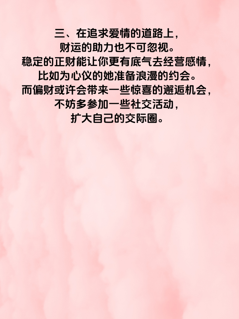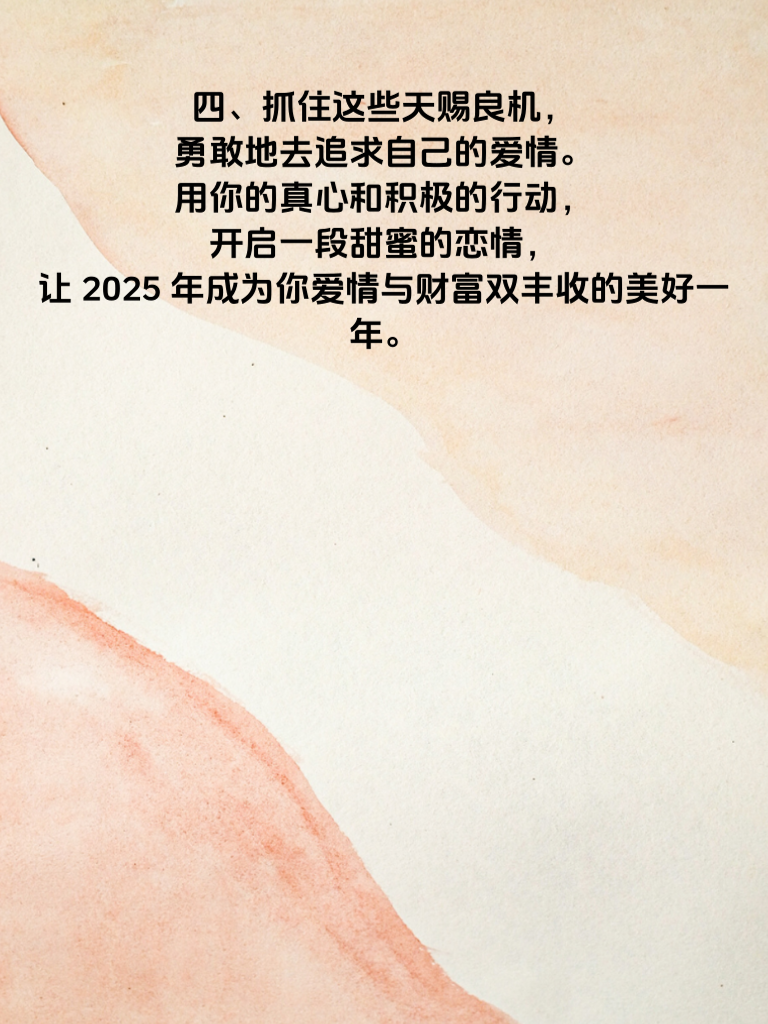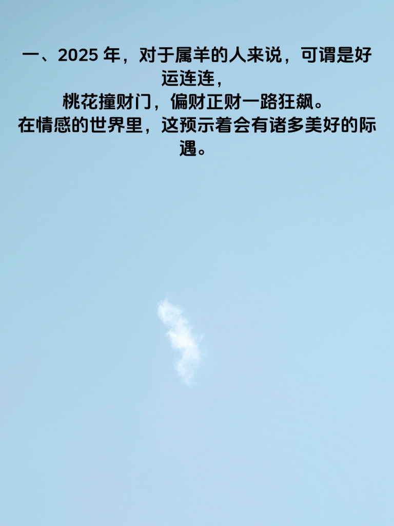 一、2025 年,对于属羊的人来说,可谓是好运连连,桃花撞财门,偏财正财一路狂飙。在情感的世界里,这预示着会有诸多美好的际遇。 二、属羊的你,在这一年更容易吸引到那个特别的人。要善于展现自己温柔、细腻且真诚的一面,这是你的独特魅力。比如在日常相处中,耐心倾听对方的话语,给予温暖的回应。 三、在追求爱情的道路上,财运的助力也不可忽视。稳定的正财能让你更有底气去经营感情,比如为心仪的她准备浪漫的约会。而偏财或许会带来一些惊喜的邂逅机会,不妨多参加一些社交活动,扩大自己的交际圈。 四、抓住这些天赐良机,勇敢地去追求自己的爱情。用你的真心和积极的行动,开启一段甜蜜的恋情,让 2025 年成为你爱情与财富双丰收的美好一年。