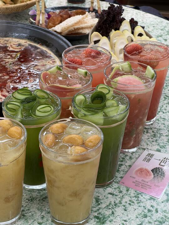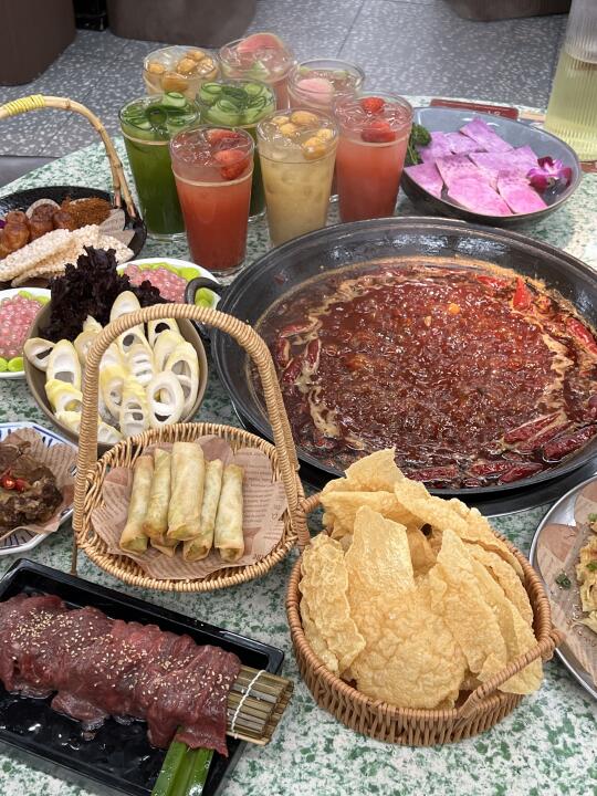 红心芭乐奶冰,好浓的芭乐香气,酸酸甜甜很解辣,和全红锅真的绝配~ 青提冰汤圆绿绿的好春天啊,糯叽叽好好吃🤤 蚕豆春卷也是头一次吃到!!好特别 还有一芭掌、黄皮果冰、甘蓝小青瓜冰…好会做饮料啊!!!