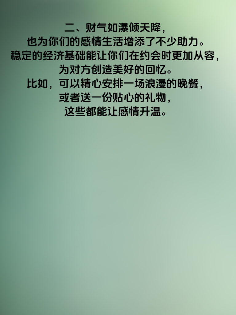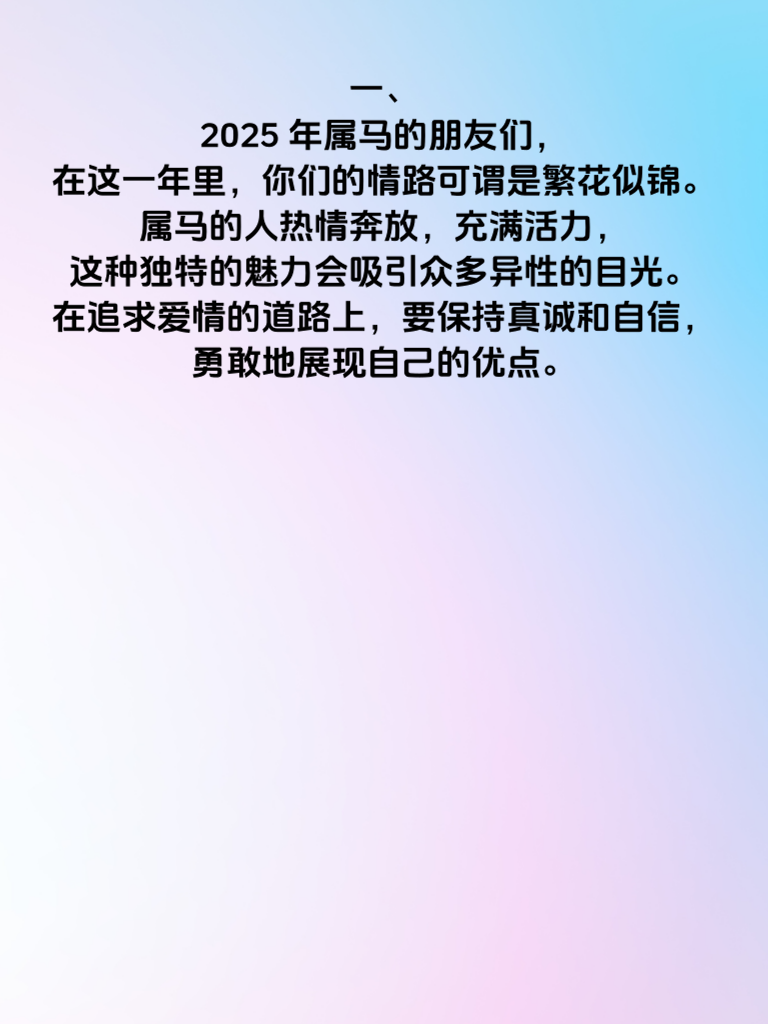 一、2025年属马的朋友们,在这一年里,你们的情路可谓是繁花似锦。属马的人热情奔放,充满活力,这种独特的魅力会吸引众多异性的目光。在追求爱情的道路上,要保持真诚和自信,勇敢地展现自己的优点。 二、财气如瀑倾天降,也为你们的感情生活增添了不少助力。稳定的经济基础能让你们在约会时更加从容,为对方创造美好的回忆。比如,可以精心安排一场浪漫的晚餐,或者送一份贴心的礼物,这些都能让感情升温。 三、在与心仪的人相处时,要学会倾听和理解。属马的人思维敏捷,能快速捕捉对方的需求。多关心对方的感受,适时地给予支持和鼓励,让对方感受到你的温暖和爱意。相信在2025年,属马的你们情路顺遂,收获满满的幸福。