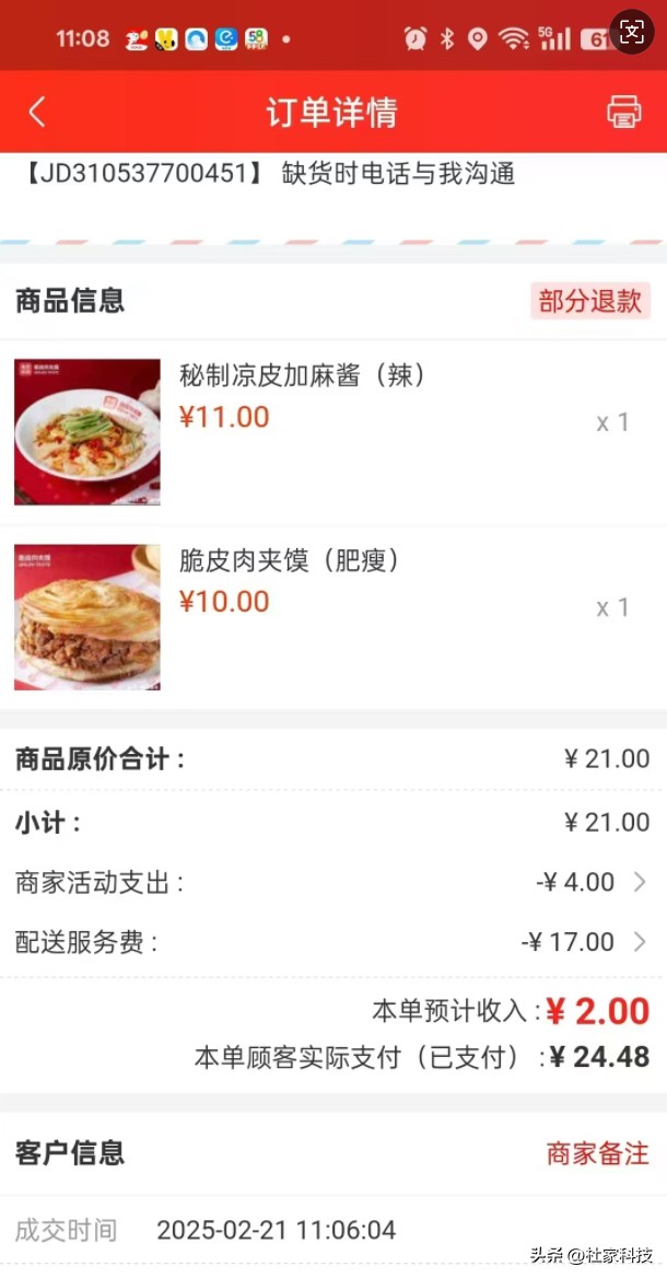 然而,突然出现了一些恶意声音,说东哥搞的外卖补贴根本撑不住,才两分钟就停了,佣金上涨到40%!这些嘲笑的言论留出不少截图,就像那份 11 块的凉皮加 10 块的肉夹馍,顾客实付 24.48元,商家扣完佣金、配送费后,最后竟只剩 2 块钱进账!这点钱连食材成本都兜不住,谁还敢跟着咱们拼事业?