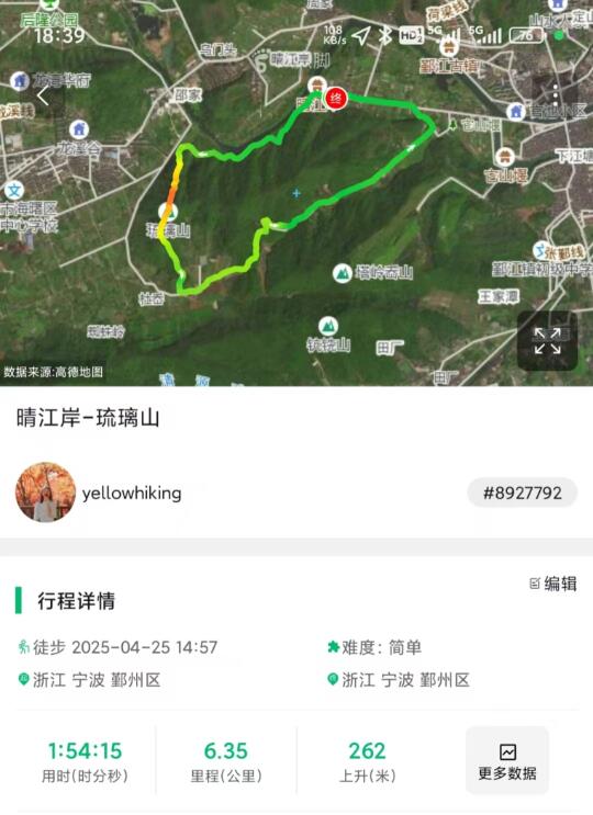 晴江岸-琉璃山 亲子小环线 轨迹编号8927792 2025-04-25 14:57 浙江 宁波 海曙区 难度:简单 1:54:15 用时(时分秒) 6.35 里程(公里) 262 上升(米) 导航到鄞江村文化礼堂,有停车场。 全程路迹清晰好走,由土路、公路组成。前面有小部分路段草密,后半部分狗多,带狗、怕狗的慎行! 晴江岸已经到了最美的季节,绿树成荫,非常漂亮! (周末或者节假日停车困难,建议早点出行,又或者可以停在鄞江攀岩公园,结合6194133一起走)