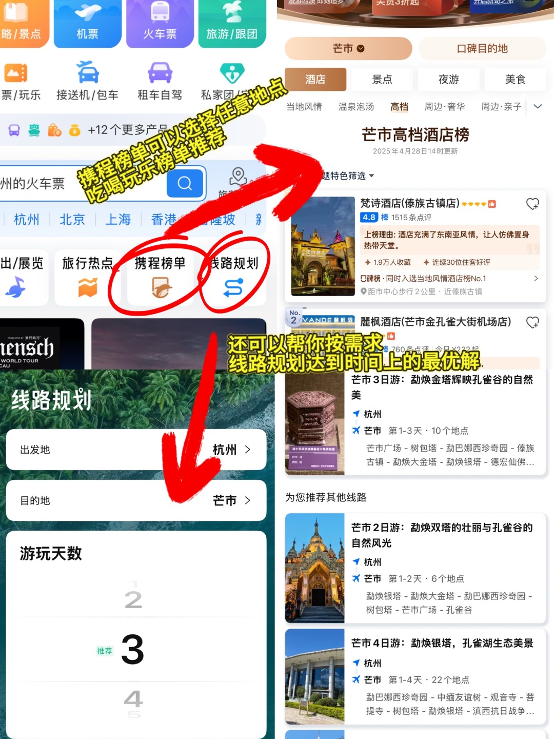 打开携程APP,点击“路线规划”,选择出发地和目的地,输入旅行天数,点击智能推荐(路线生成后也可自己手动修改行程),一条完美的旅行攻略就OK了,而且推荐线路中包含了大部分口碑榜上必打卡的当地景点,不绕路,非常高效,特别是第一次去某个目的地没有概念的时候,这个路线功能能帮你一网打尽所有值得去的景点。