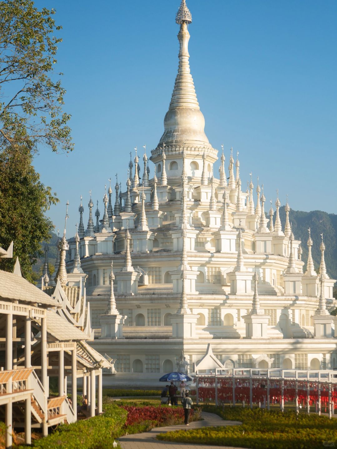 银塔更出片,建议穿鲜艳长裙,租傣族服装拍写真。 傍晚亮灯后氛围感拉满,可俯瞰芒市全景。