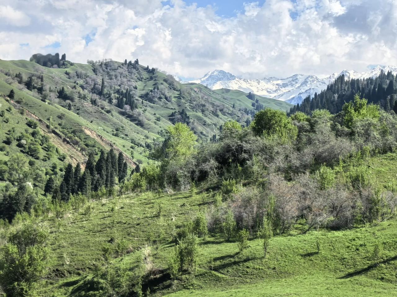 4月底到5月2日这段时间,南疆的沙尘暴很严重,导致伊犁这边也受到影响,高空都有浮尘,视线不是通透,天空是灰蒙蒙的。 2号下了一场雨,这场雨真是及时雨。 我们3号,没有选择火出圈的恰西,库尔德宁,萨哈,随便找了个一条,远离人群的沟,徒步开始,上到山坡上,一下被山坡下的风景给治愈了,头天下的雨,把整个世界像洗了一遍,作为一个到处看美景的人也被这里征服了,美不美,大家评论,别问我是哪里,朋友带我去的,不知道这是撒地方,只知道是新疆伊犁,徒步了20公里一直没有感觉到累。 旅行