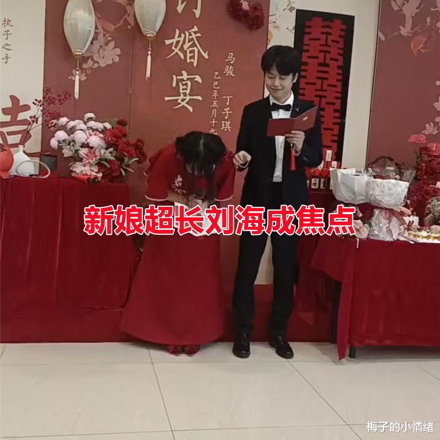 当新人默契十足的拿着主持稿感谢着现场来宾时,本该是一幅温馨和谐的画面,然而,当镜头聚焦到新娘的发型时,全场气氛却微妙地转向了戏剧性——超长的齐刘海如瀑布般垂落,几乎遮住整张脸,低头行礼时,隐约只露出苍白的下颌线,引得宾客们面面相觑。