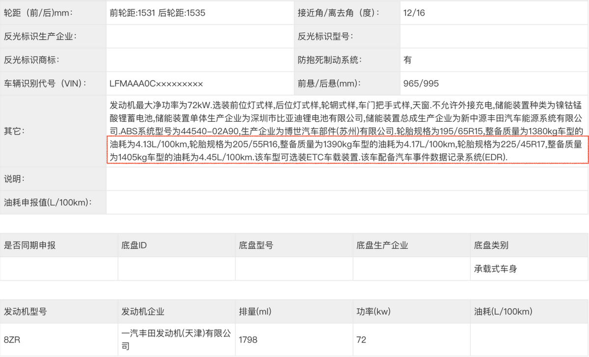 动力方面,卡罗拉也完成了一次关键升级。在这一批申报中,卡罗拉依旧提供了燃油版与油电混动版,其中,燃油版终于迎来了与海外一致的2.0L自然吸气发动机,M20E型号2.0L本质上是荣放RAV4的同源版本,能提供126kW(171Ps)的最大功率,而峰值扭矩预计有206N·m,传动上预计也会继续提供10速CVT无级变速箱,整体性能会优于现款燃油版。同时,油电混动依旧为1.8L发动机与电机的组合,根据配置规格不同,其可实现4.13-4.45L/100km的综合油耗。不过,这组数据是稍稍高于现款的,不知道量产上市后会不会有什么变化。