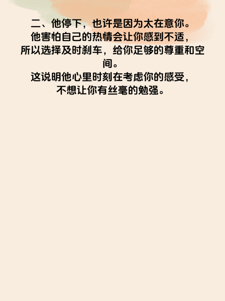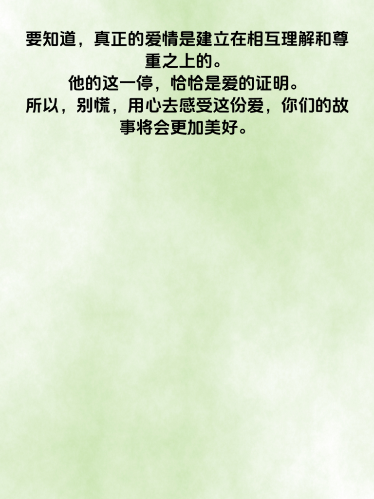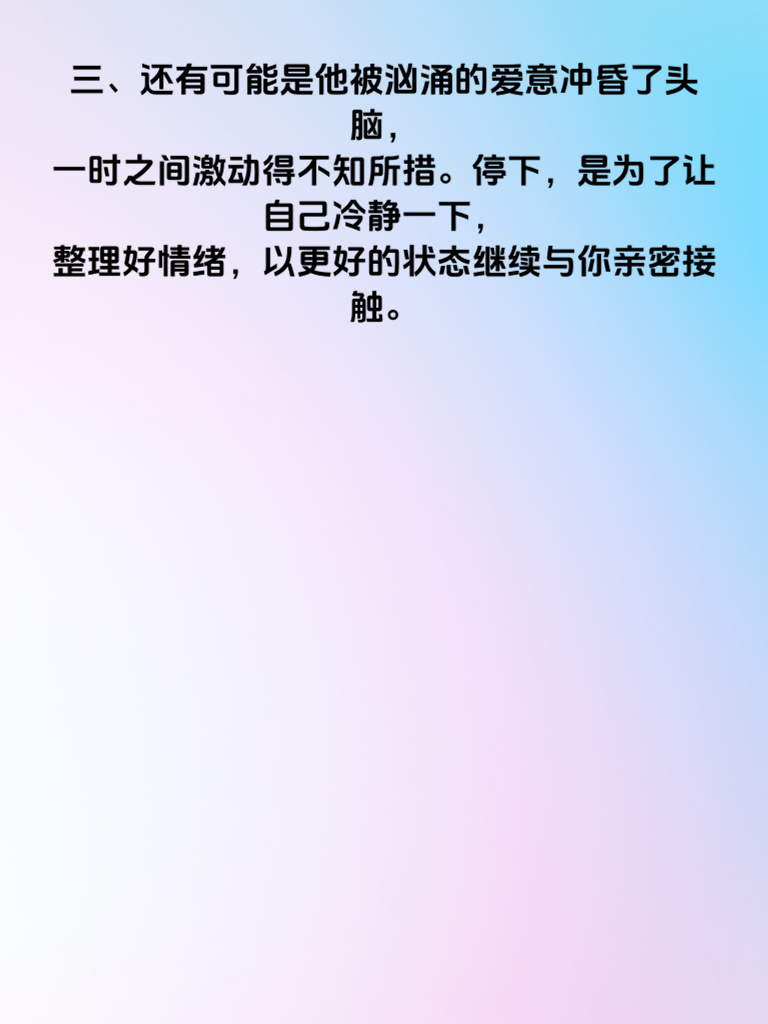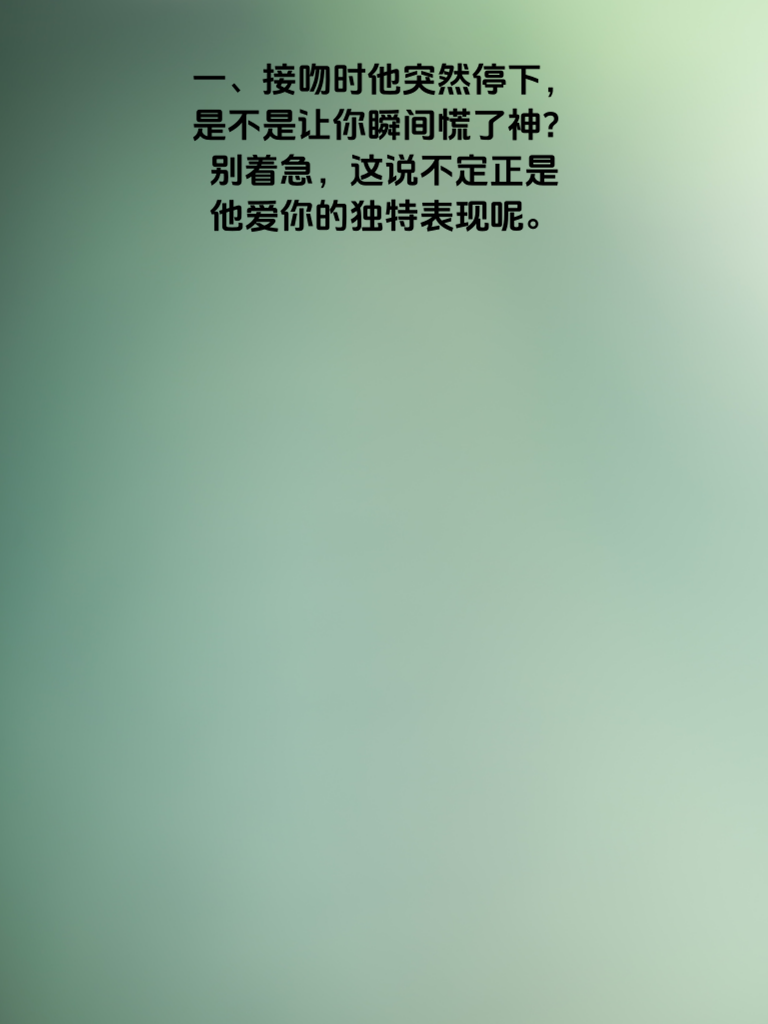 一、接吻时他突然停下,是不是让你瞬间慌了神?别着急,这说不定正是他爱你的独特表现呢。 二、他停下,也许是因为太在意你。他害怕自己的热情会让你感到不适,所以选择及时刹车,给你足够的尊重和空间。这说明他心里时刻在考虑你的感受,不想让你有丝毫的勉强。 三、还有可能是他被汹涌的爱意冲昏了头脑,一时之间激动得不知所措。停下,是为了让自己冷静一下,整理好情绪,以更好的状态继续与你亲密接触。 四、当遇到这种情况时,你不妨轻轻看着他的眼睛,温柔地询问他的感受。通过沟通,你们能更深入地了解彼此的心意,感情也会在这个过程中升温。 五、要知道,真正的爱情是建立在相互理解和尊重之上的。他的这一停,恰恰是爱的证明。所以,别慌,用心去感受这份爱,你们的故事将会更加美好。
