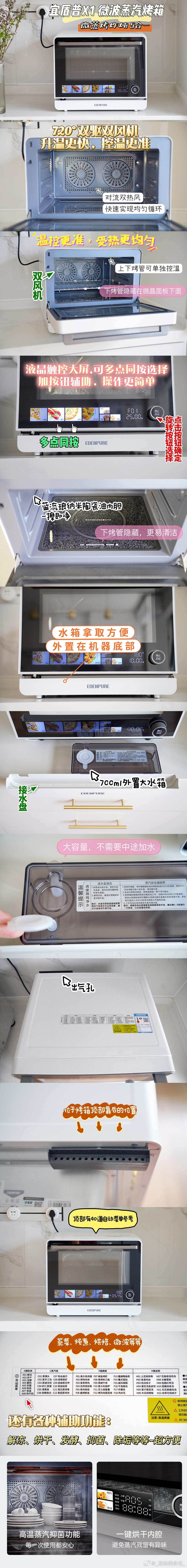 它是我目前用过的zui全能的微波蒸汽烤箱,之前用过的蒸箱,没有微波功能、只有上烤管加热、没有双风机受热不均匀,只能做蒸箱用,有些浪费,这台则不会,一台顶n台机器~ 厨房空间不大、又需要微波炉+蒸箱+烤箱+空气炸锅的,不要犹豫,选它不会错~