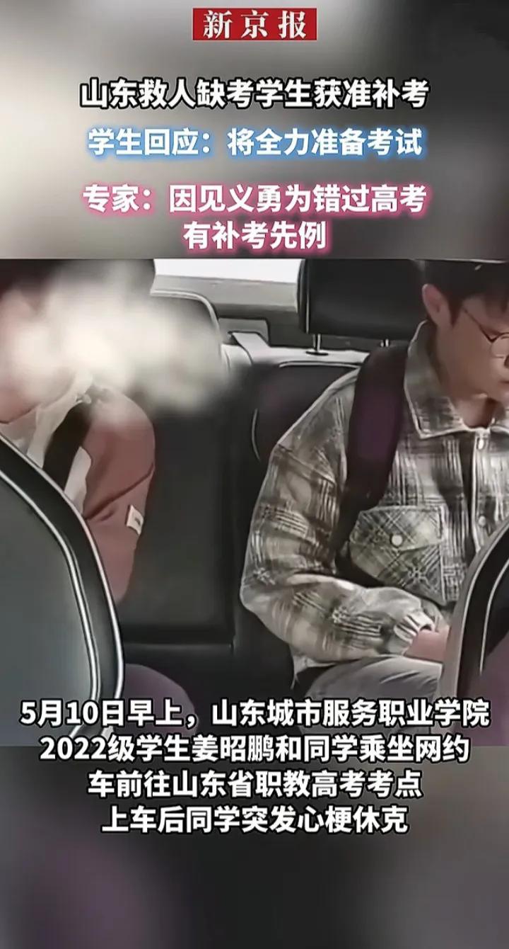 最近在网上热传的为救心梗同学而错过职高语文考试的山东烟台小伙姜昭鹏,终于可以参加补考啦! 据来自山东省教育招生考试院的官方消息,当地教育考试单位和山东省城市服务技师学院,核实情况属实,已报请上级主管部门同意,将按照规定程序,启用春季高考语文科目附题,安排姜昭鹏参加语文补考。 当记者问及姜昭鹏救人时心里怎么想的,他说: "生命只有一次,但是考试可以重来",这就是新时代的青年学子姜昭鹏,他还告诉记者,未来他要学医,救治更多的人。 日前,姜昭鹏已被授予"烟台市见义勇为先进个人"荣誉称号。