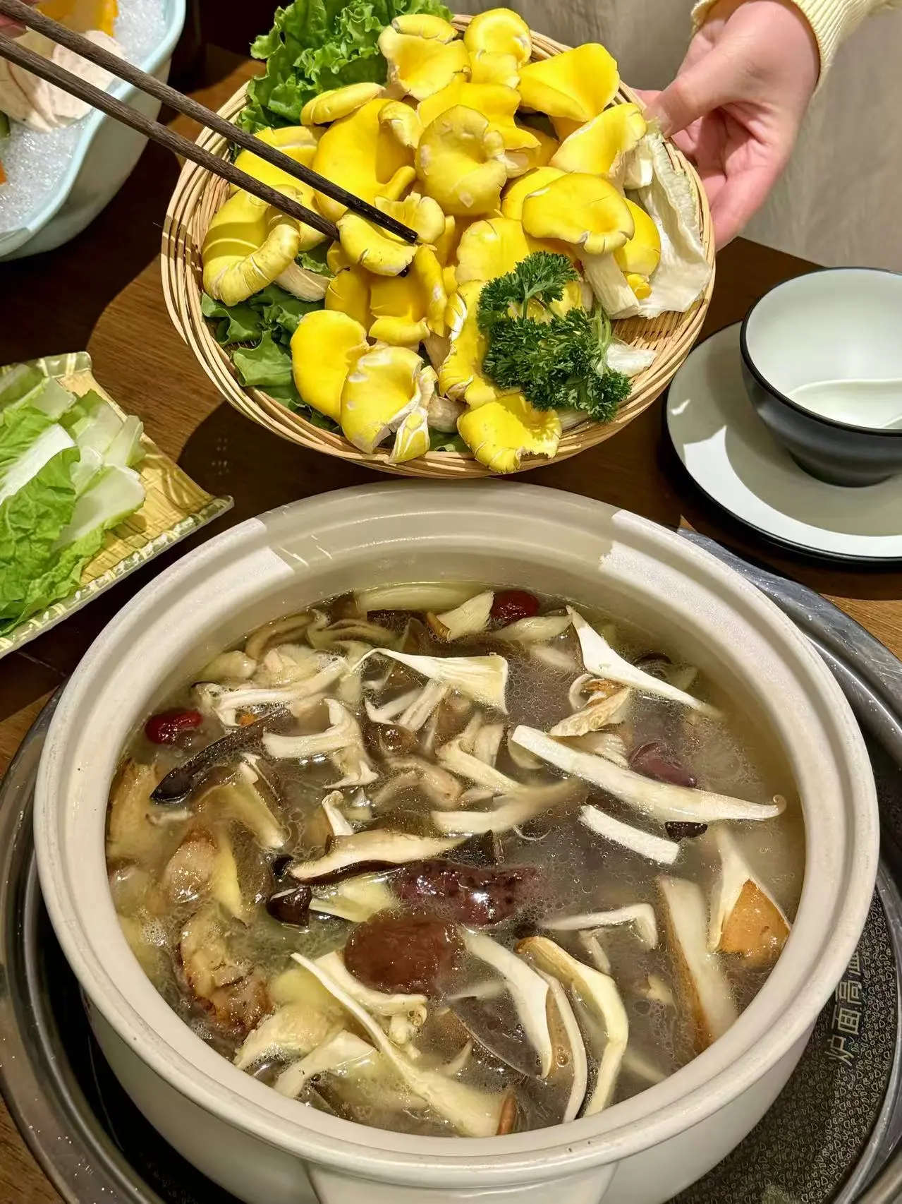 种类丰富多样,有羊肚菌、虫草花、姬松茸、鸡油黄…好多种菌子一起煮下去汤好鲜!真的鲜掉眉毛的程度!!炫三碗停不下来😃