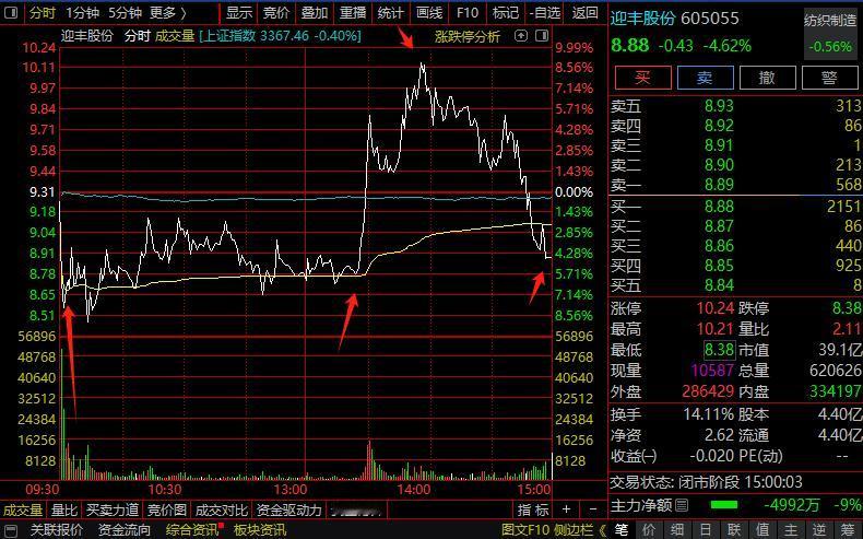 来回收割,谁所为? 开盘被核至跌停,午后拉升接近涨停,如果成了,就是地天板;可惜失败了,又从接近涨停下跌,跌幅达4.62%,一天来回收割,这种行为,是否恶意操控呢? A股低开,全天水下震荡,截止收盘,沪指跌0.40%,收报3367.46点;深证成指跌0.07%,收报10179.60点;创业板指跌0.19%,收报2039.45点。全市成交11242亿,市场量能在持续萎缩了,较昨日11906亿缩量。 市场情绪与大盘指数分离,有所回暖,个股涨多跌少,上涨3002家,涨停68家,有中毅达、渝三峡、成飞、利君、连云港、南京港、京运通、郑中设计、两宁波、信隆健康等涨停;下跌2187家,跌停11家。 市场主线依然不明,涨一天或两天就换,没有持续性,节奏对了才能赚钱。近期活跃的题材有军工、外贸、化工等,今日汽车类表现较强,有铭科、天汽模、秦安等涨停。