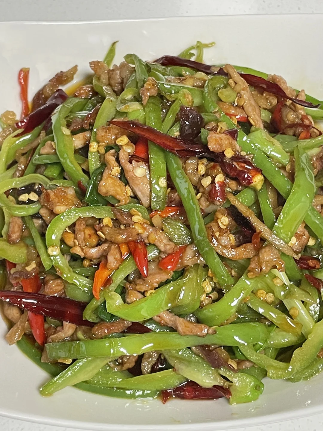 3⃣️起锅烧油,锅中菜籽油热,将肥肉丝先下锅煸炒出油脂,然后放入瘦肉和姜蒜。在锅中炒熟,再倒入干辣椒和小米辣炒出香味,放入青椒,加入一勺生抽,一勺蚝油,适量的盐和鸡精翻匀。炒至青椒熟时加入葱翻匀即可出锅。