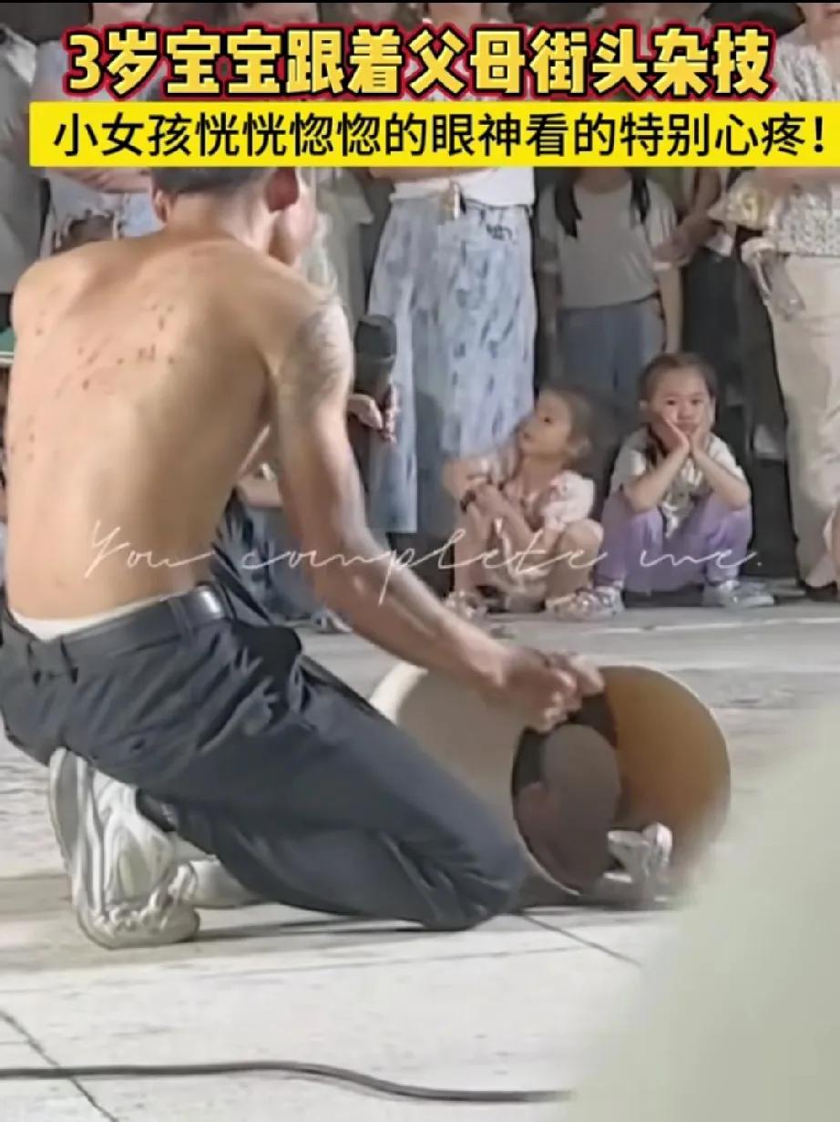 真是同龄不同命,观众席上是无忧无虑的童年,桶里装的却是生活所迫的童年! 一名三岁左右的小女孩,在爸爸一声声的卖力吆喝和观众的一声声喝彩中,需要将身体折叠起来装进一个小圆桶里,不哭不闹非常配合地表演所谓的“缩骨功”。爸爸后背上那一个个点状疤痕,就能猜出他大概是经常表演滚钢钉之类的杂技,身上的纹身似乎讲述着他曾经叛逆的青春。 所以很多有女孩的家长最怕孩子被校门口的“小黄毛”惦记上,因为跟上他们之后,那人生几乎没有未来可言,连孩子都要跟着吃苦受罪。
