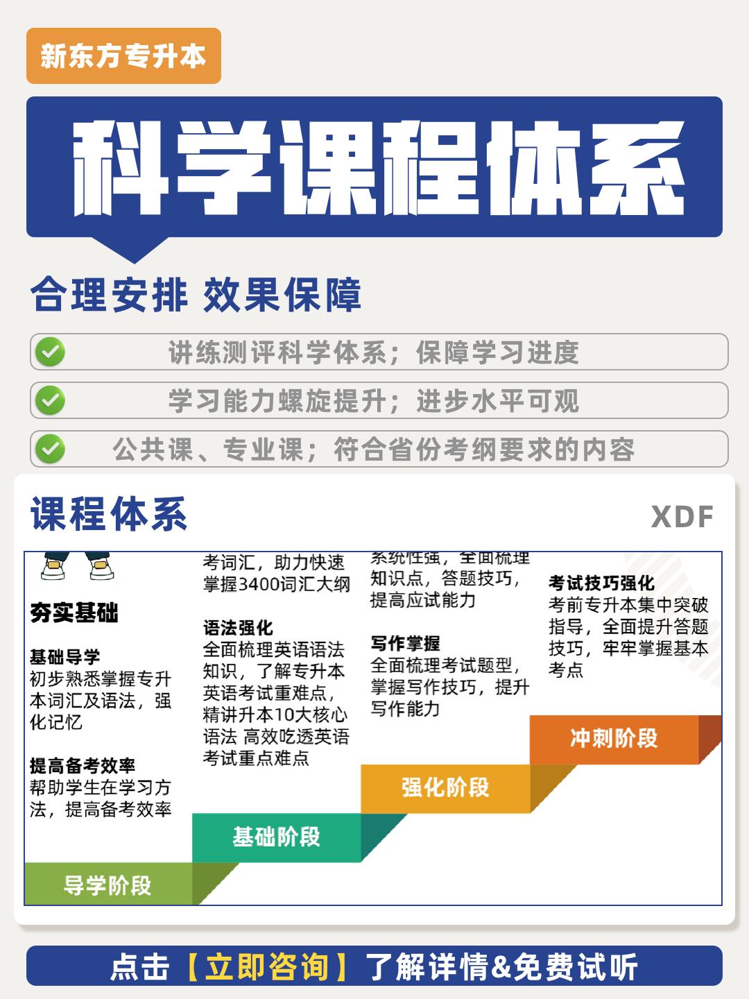 专升本报班 就来超🔥的新东方。新东方专升本线下辅导班开始报名啦!你没有看错! 👏【严选优质教师】新东方老师经验丰富,功底扎实!根据学生的不同需求采取不同的授课方式,环环相扣,不断进步! 👏【科学课程体系】不论是公共课还是专业课,超专业且科学的课程安排保障学习进度,学习能力螺旋上升! 👏【贴心伴学服务】学管老师认真督学,拒绝拖延!课前课后温馨提示,学习不掉队~ 👏【舒适学住环境】认真的学习一定要有良好的后勤保障,宿舍楼、教学楼基础设施完备,让学习更加舒心~ 统招专升本