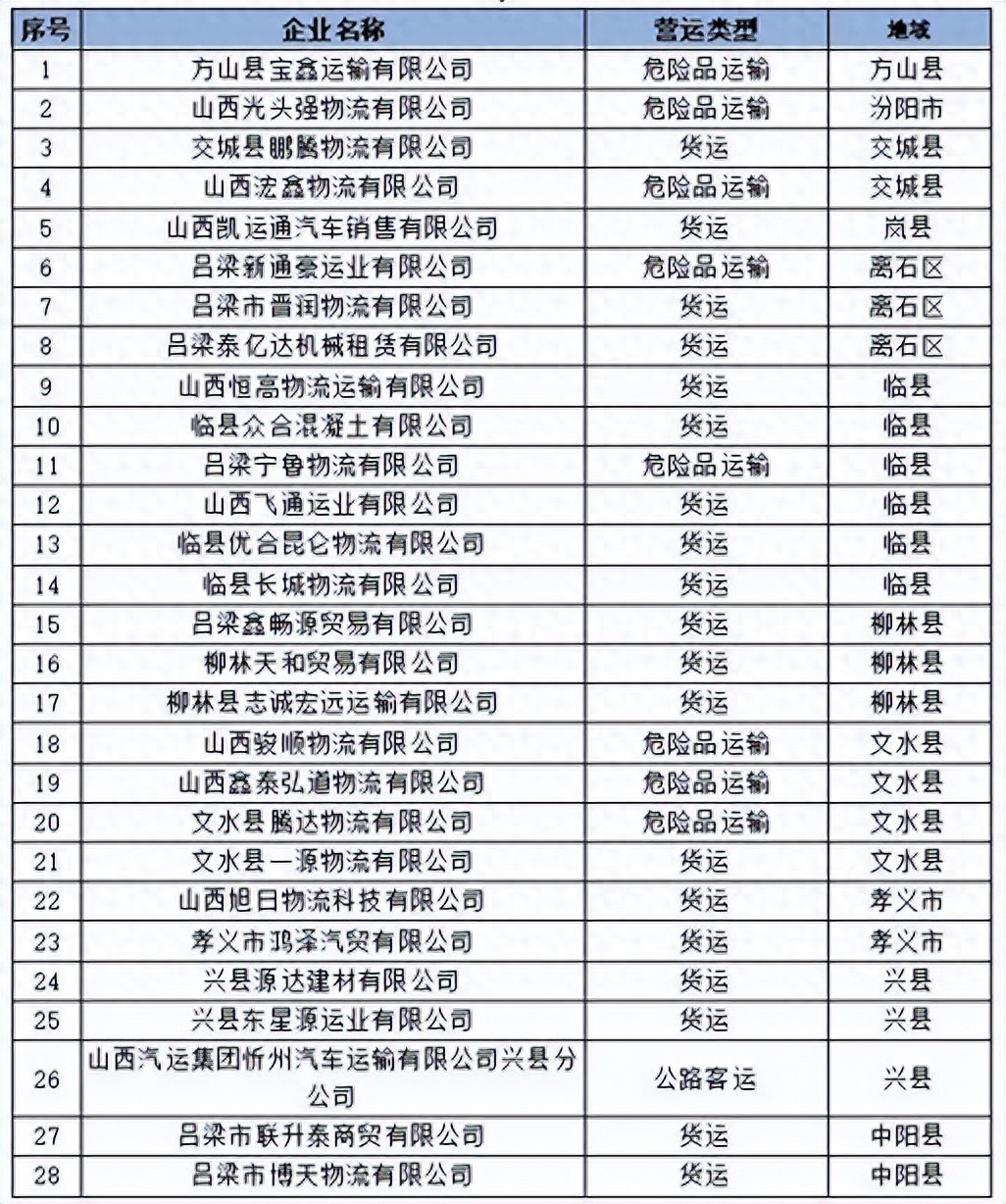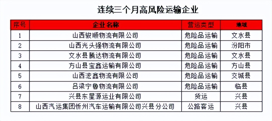 为进一步加强重点运输企业源头监管,推动企业落实安全管理主体责任,有效预防和减少道路交通事故。根据公安部交管局大数据研判平台推送,吕梁市2025年11月份涉及高风险运输企业为28家(危化品运输企业8家),连续3个月被评估为高风险运输企业8家,现予以全市曝光。请相关企业责任人高度重视,加强内部安全风险管控,认真开展驾驶人安全教育,及时消除道路交通安全隐患,扎实落实安全主体责任,特别加强危险化学品运输车辆的安全管理工作。