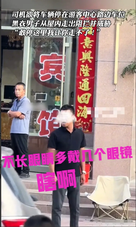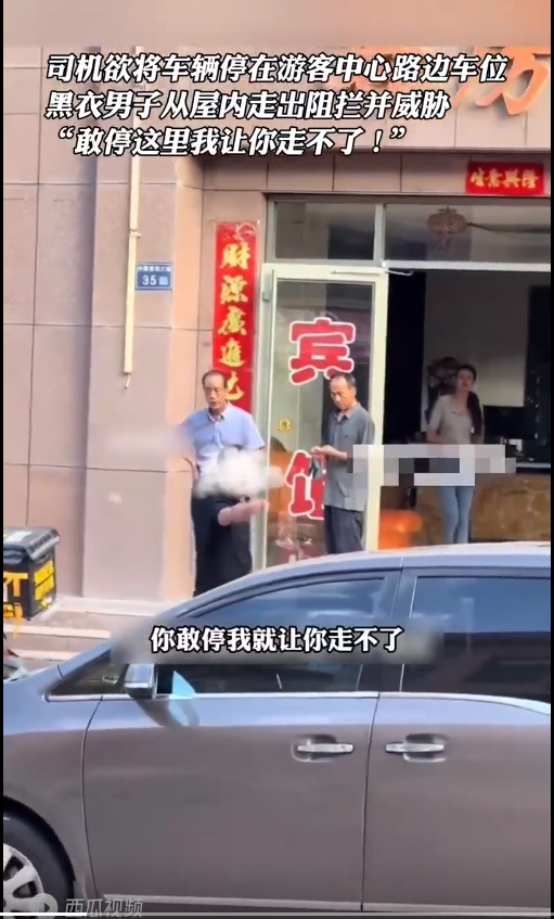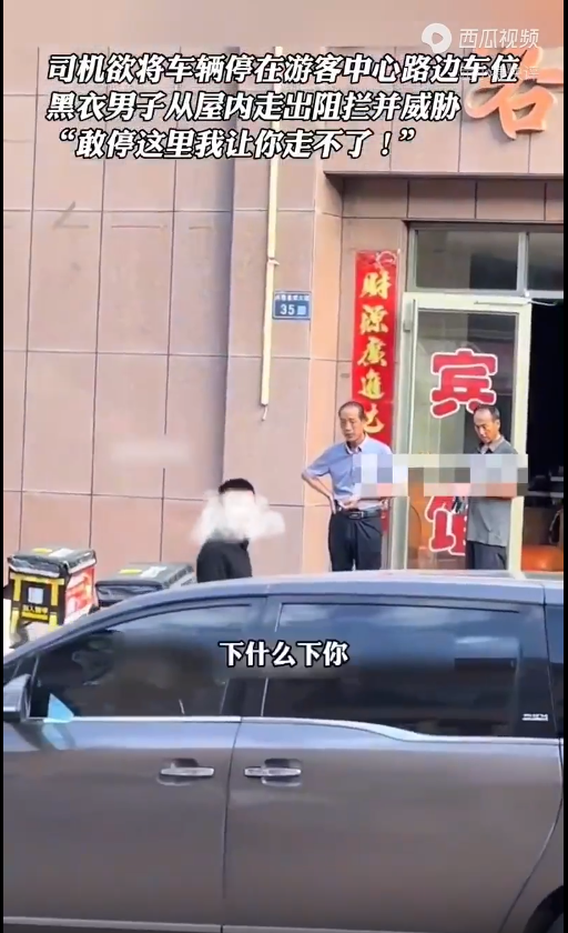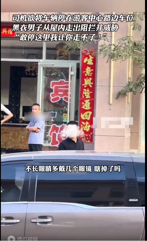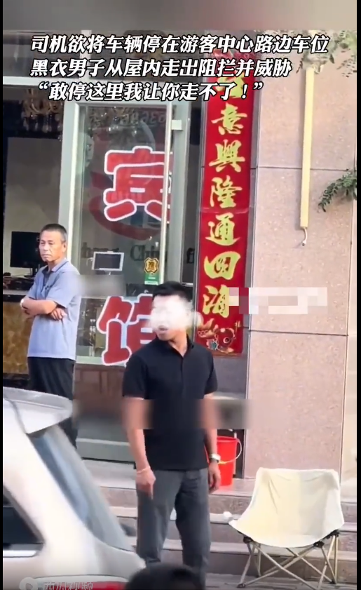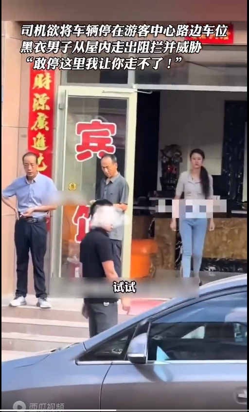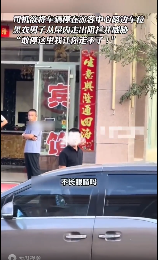 视频显示,当游客将车缓缓驶入停车位时,一名身穿黑色上衣的男子快步走来,语气强硬地要求车主离开:"你把门挡住了看不见吗?你敢停我就让你走不了!"