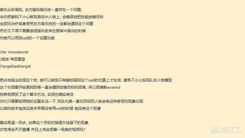 新帖子中也提到,友方鼠标指向宏一直存在一个问题,当你不小心把鼠标移到游戏中的人物上,会错误地把技能放错目标,所有玩治疗或者使用友方指向宏的玩家一定都会遇到这个问题。而当你需要做成指向宏来在框架中指向目标时,就可以用到cell的一个设置功能,这也有力地回应了质疑,并且表示他们每打一个本都有log和录像,这算是对开挂质疑最有力的回应。