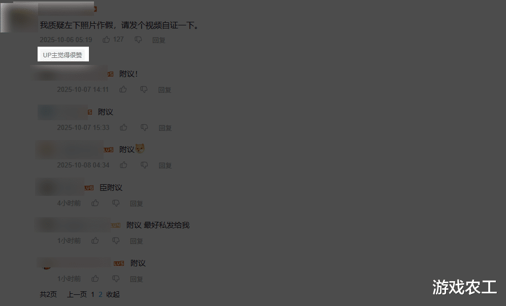 外挂的事情结束了,但还有另一件事没结束。玩家们不仅质疑米一根开挂,还有玩家在评论区质疑左下照片作假,要求“发个视频自证一下”。该质疑回帖下面全是附议,UP主也觉得很赞,更有人直接在评论区表示最好私发。对于这种质疑,我也附议,毕竟遇到这种事情,评论区的玩家空前团结。