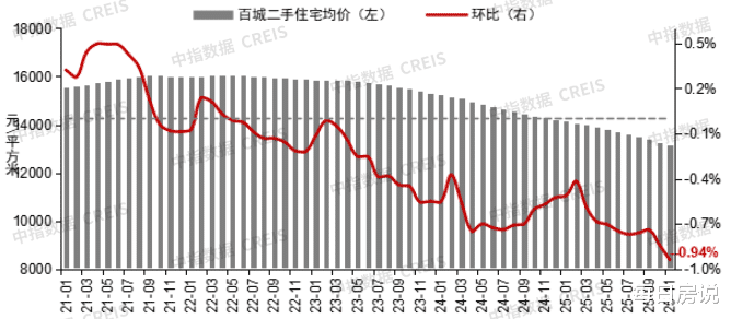 二手房的成交占比越高,库存量越大,议价空间就普遍上涨,也就是说买方有绝对的话语权,数据也佐证了这一点:11月百城二手住宅均价环比下跌0.94%,跌幅较上月扩大0.1个百分点,同比下跌7.95%。