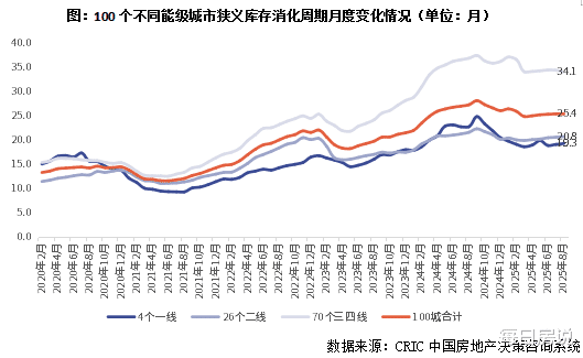 这也意味着在人口红利时期建立的住房供需关系,必然要面临根本性的变化。不仅仅是需求端的显著萎缩,过去依赖人口增长的扩张模式,也使得住房市场整体进入了供应过剩的状况。截至2025年10月,全国商品房待售面积已达到7.56亿平米,尽管年内已经连续8个月减少,但仍然比去年年底多了279万平米。据克而瑞监测,8月百城去化周期基本持稳25.4个月,一二线持稳20个月左右,三四线去化周期仍达34个月,去化风险较高,供需矛盾加剧,进一步压制了房价的上涨动力。