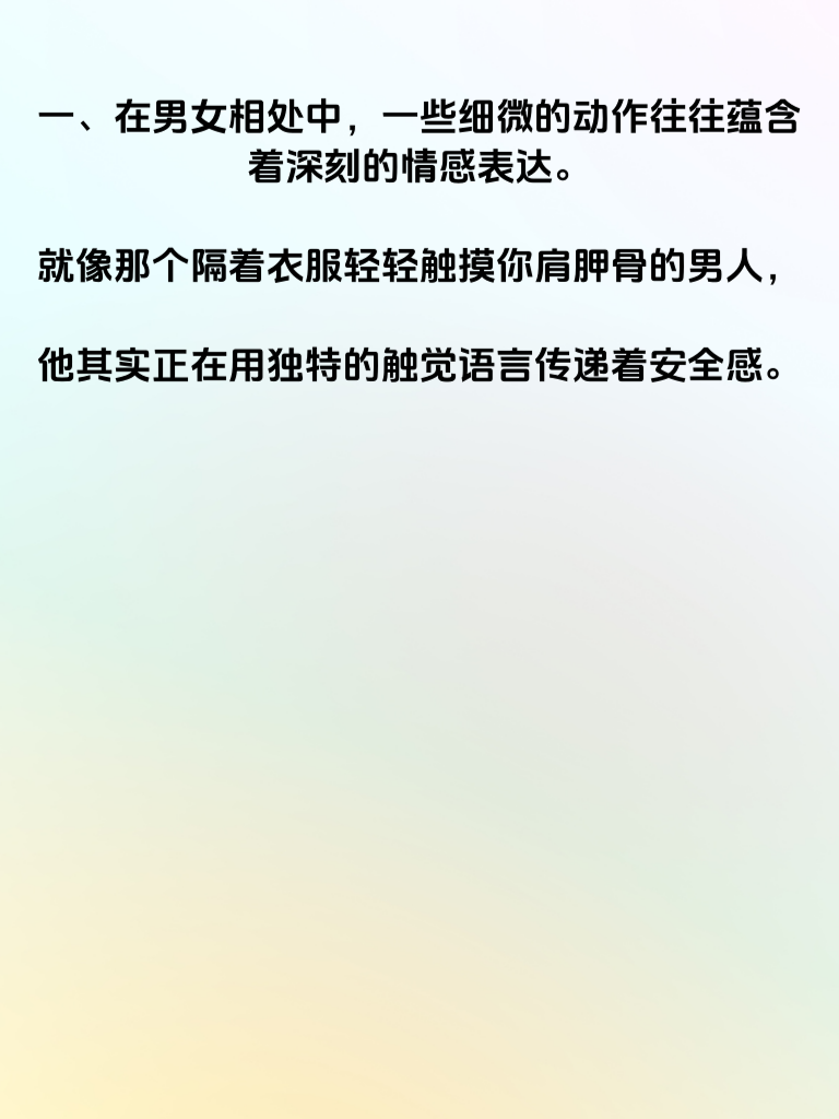 一、在男女相处中,一些细微的动作往往蕴含着深刻的情感表达。就像那个隔着衣服轻轻触摸你肩胛骨的男人,他其实正在用独特的触觉语言传递着安全感。 二、肩胛骨,那是人体较为敏感且脆弱的部位。当他的手隔着衣物落在那里,看似不经意,实则是一种温柔的靠近。这意味着他想给予你安心的守护,让你知道在他身边无需担忧。 三、这种触觉上的交流,比言语更能直达内心。它暗示着他对你的在意,愿意用身体的接触去感受你的情绪起伏,给予你无声的支持。 四、对于女生而言,这样的举动会带来别样的温暖与踏实。它能让你们之间的情感纽带更加紧密,让你真切地感受到他的关怀。 五、如果在生活中遇到这样的他,不妨用心去体会这份细腻的情感。也许,一段美好的缘分就会在这不经意的触觉触碰中悄然绽放。