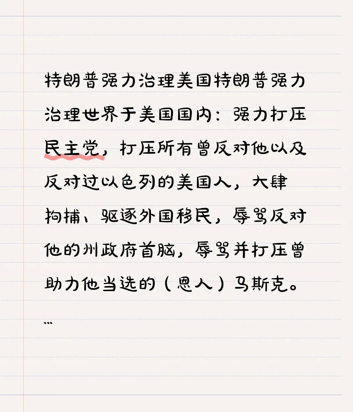 特朗普强力治理美国 特朗普强力治理世界 在美国国内:强力打压民主党,打压所有曾反对他以及反对过以色列的美国人,大肆拘捕、驱逐外国移民,辱骂反对他的州政府首脑,辱骂并打压曾助力他当选的(恩人)马斯克。 在世界各国:企图兼并加拿大,欲将墨西哥湾改名,妄图夺取格陵兰岛,辱骂乌克兰、德国等国领导人,对包括其盟友国在内的国家暴力加征关税,武力威胁伊朗,进行长臂管辖技术出口。 当众人都在臆想特朗普的支持率急剧下降的时候,马斯克向特朗普投降、道歉了;加州州长并没有敢于宣布独立;中国以外的大部分国家在寻求美国放过、寻求关税别加那么多。这到底是特朗普的成功,还是人性的软弱呢?