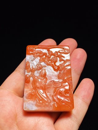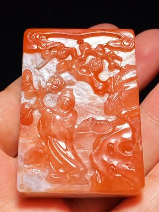清乾隆 南红玛瑙 俏雕 踏雪寻梅 诗文牌 子冈牌 挂件 长4.1 宽1.3 高6.1厘米 重81.3克 南红玛瑙古称“赤玉”,质地油润,产量稀少。南红玛瑙除了雕刻,还可以入药,古人认为其可以养心养血。此外,佛教徒亦格外珍视南红玛瑙,佛教七宝中的赤珠就是由这种材料制作而成。此件南红玉牌,正面以俏色高浮雕观音,观音衣着鲜明,头戴风帽,笑容满面,扶俏色梅枝,栩栩如生。身后山石峭立,寒梅疏枝绽放,怡然自得。背面阳刻诗文“探春绕遍玉阑干,香暗冰痕屐齿寒。 怕有花头遭冻损,枝枝呵手掐来看。 ”,落“子冈”款。此类玉牌多为白玉材质,南红玛瑙极为少见,难度更甚,十分罕见,玉牌地子处理平整如镜,尤见工力,刻工精细不乱,为标准的乾隆宫廷造办处玉作器物。