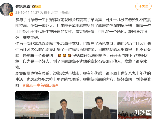 现场媒体不少,看完两集,他们也称,2025年悬疑剧繁多,却没有一部真正的爆款,《命悬一生》可能会是今年第一部拉爆的悬疑剧。