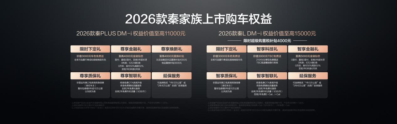 2026 款秦 L DM-i 与 2026 款秦 PLUS DM-i 210KM 长续航版的同步上市,不仅以超长续航打破出行边界,更以豪华科技配置重塑家轿体验,精准覆盖不同家庭的出行需求。作为插混轿车市场的引领者,秦家族凭借硬核产品力与越级价值,必将成为 2026 年行业风向标,引领家轿市场迈向高品质发展新阶段,为更多家庭带来更优质、更经济、更智能的出行解决方案。