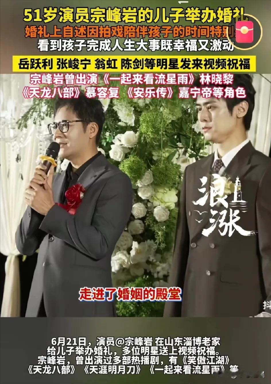 喜当公公的宗峰岩,给所有男演员上了一课, 特别是没有背景没有人脉的人, 一定要记住:在什么年龄段做什么事,该奋斗就奋斗,该结婚就结婚,该生子就生子。 别老了事业一无所成,还错过了最佳结婚的年龄。 宗峰岩,在娱乐圈是知名配角,在《仙剑奇侠传三》《天涯明月刀》《宫》《无忧渡》等大爆剧中都有不俗的表现。 和胡歌、宁静、杨幂是老搭档了。 近日,他迎来了一个大喜事,那就是儿子结婚了。 才51岁,就喜当公公,这把宗峰岩感动的热泪盈眶,在儿子的婚礼上盛装出席,激动发言。 他满眼深情的看着儿子,仿佛有千言万语想说给孩子听,最后,所有的疼爱与温柔,都化作了一句“祝新婚快乐。” 看多了明星晚婚晚育,突然看到宗峰岩才51岁就当公公,很不适应。 比如,郭富城、周杰伦等人过了50岁才结婚生子;像苏有朋、何炅、古天乐这些人,年过半百还未婚,而像汪峰、李亚鹏这些人离了几次了还没个安定的心。 所以,宗峰岩51岁当公公,仿佛是一件稀罕事。 其实,这才是正常的人生规划,谁说婚姻和事业不能同时进行呢? 该努力演戏的时候,就认真打磨作品;遇到了真爱就珍惜并结婚,有孩子了就全力托举孩子,这样,既避免了老无所依的尴尬窘况,还能把人生交代的更完整。 你说是不是? 所以啊,演员就别立什么单身人设了,把握幸福才是最重要的。